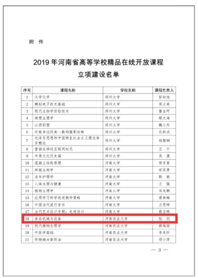 《食品机械与设备》是食品科学与工程类专业的核心课程,在本校开课于1989年,已经有30多年的历史。经过多年的建设,2011年被评为“校级优秀课程”,建设了内容丰富充实的课程网站,开始信息化教学;2017~2018年,由于课程改革的突出成绩,课程被评为“校级核心示范课程”,本课程团队被评为“校级优秀基层教学组织”;2019年,被评为“河南省精品在线开放课程”,在2020年全省的在线课程评价时,被评价“优秀”等级。