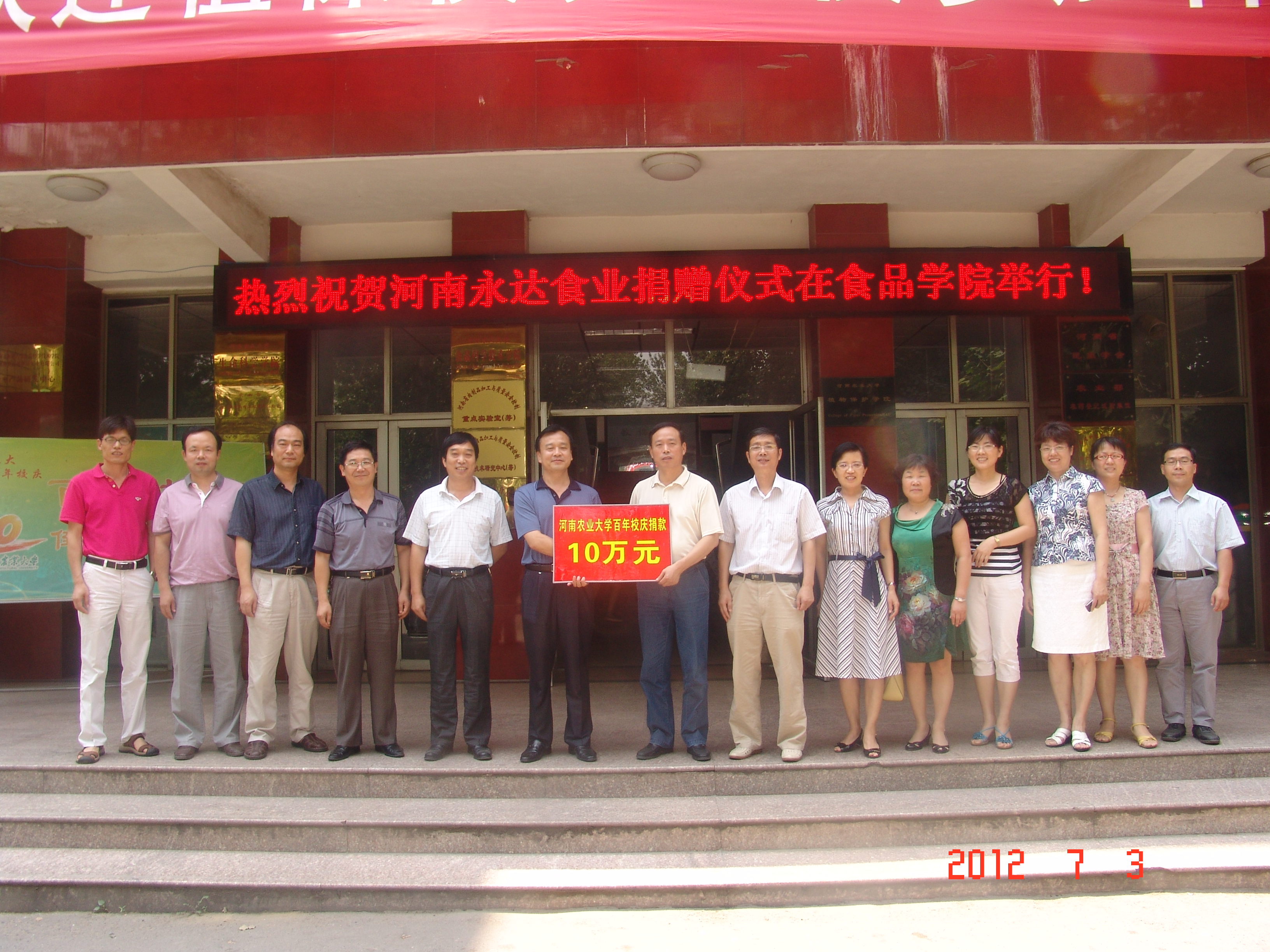 为庆贺我校百年校庆和食品学院承办的第十届中国肉类科技大会的召开,河南永达食业(集团)有限公司捐资10万元在我校建立“河南农大——永达肉类科技信息中心”。7月3日上午,捐赠仪式在食品学院报告厅举行。