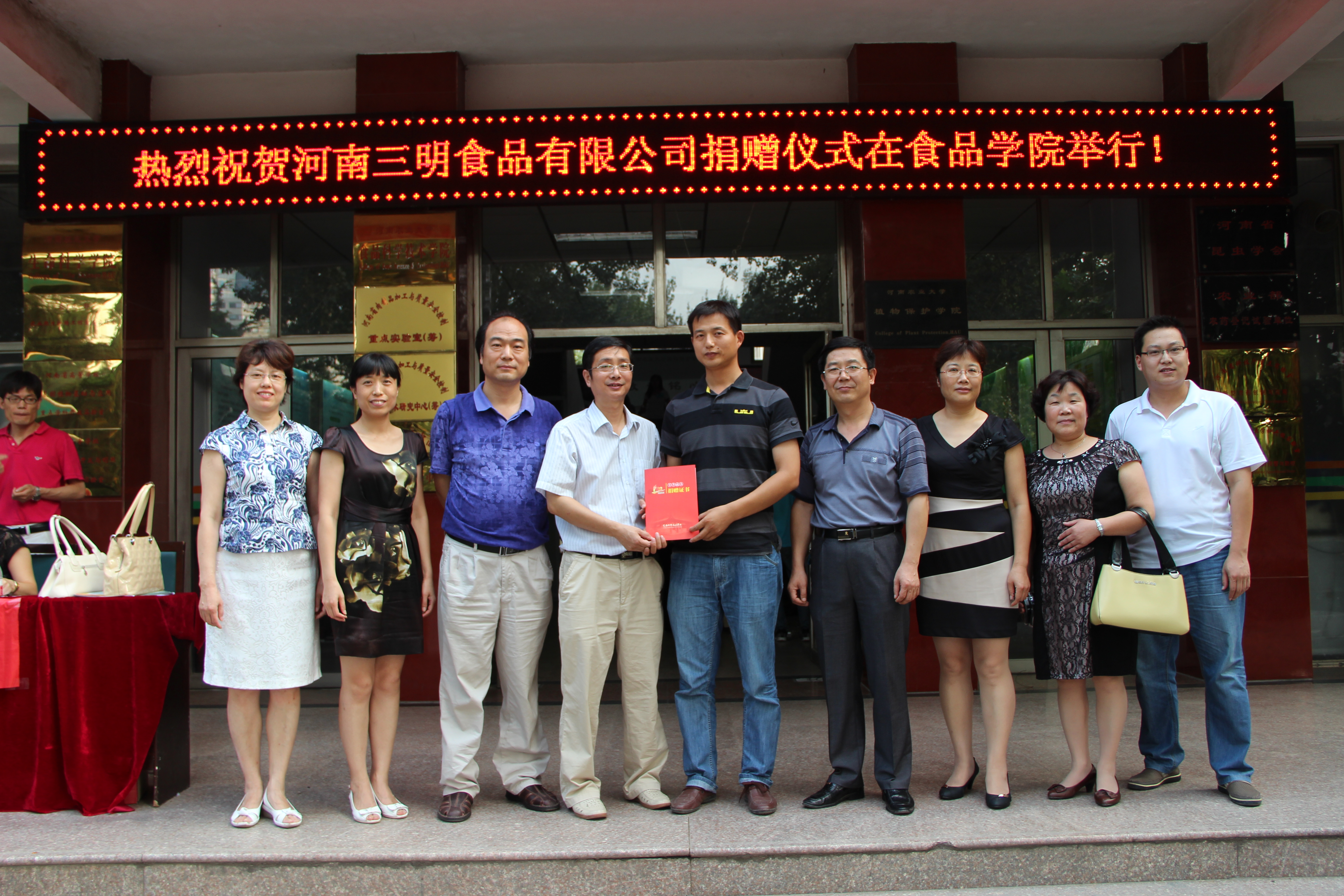 7月5日,河南三明食品有限公司捐赠仪式在食品学院报告厅举行,三明食品副总经理王永生代表公司捐赠花菇酱礼盒200份(价值2万元)贺河南农大百年校庆,学院领导班子和部分教工参加了仪式。