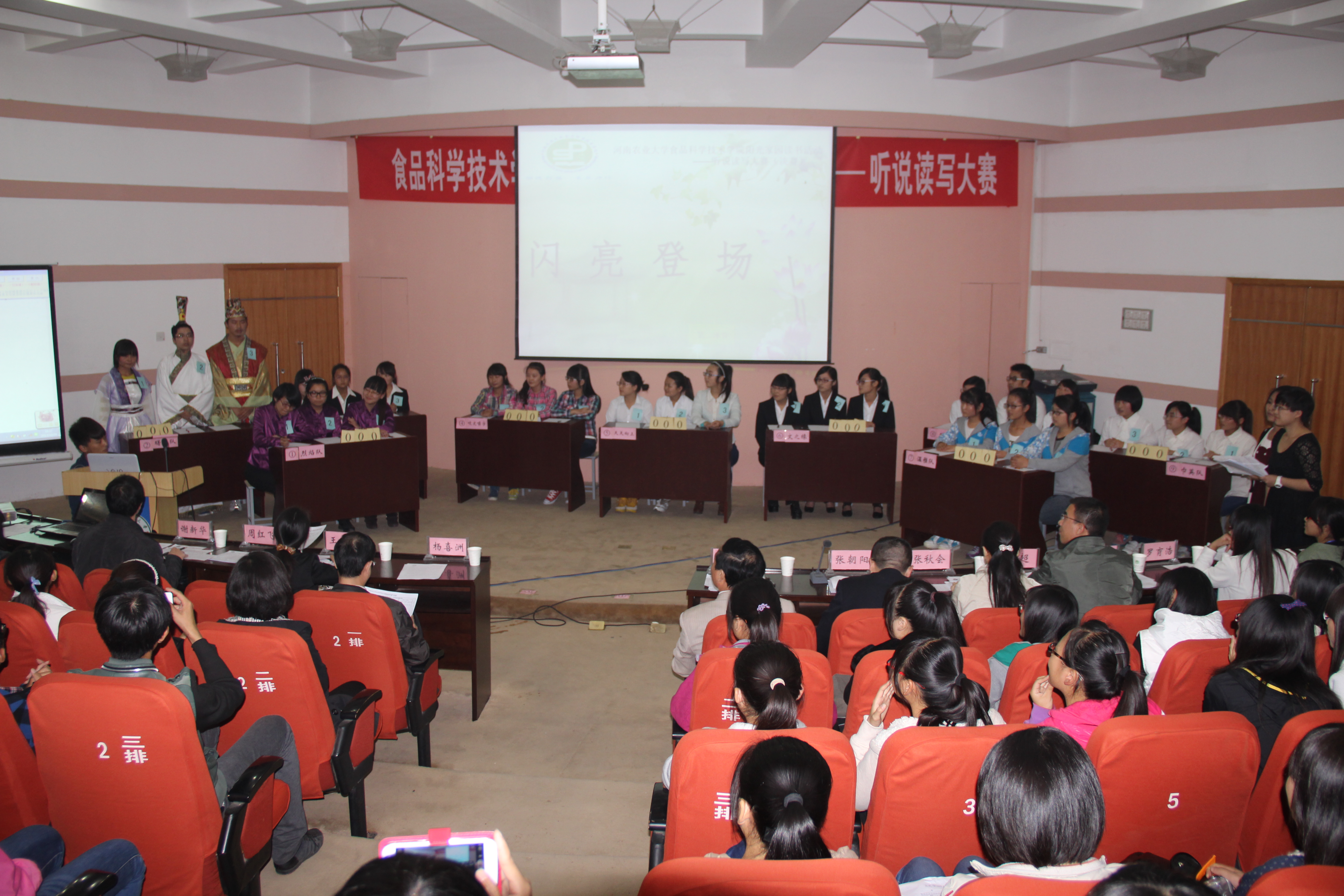 决赛现场,从预赛中脱颖而出的9支队伍围绕汉字运用展开了三轮激烈的比拼。活动内容有耳目一新的“闪亮登场”、紧张激烈的“一鼓作气”、饱满真挚的“琅琅上口”和娓娓道来的“总结陈述”等环节,成语听写、古诗词填空、经典诵读、选字造句等一道道题目考验着选手们的知识储备,也展示着选手们的风采,同时配以现场点评嘉宾、校办副主任张朝阳老师的点评释义,给现场观众带来了一场丰富的汉文化视听盛宴,也在寓教于乐中进行了一次汉字知识和中华传统文化的普及。