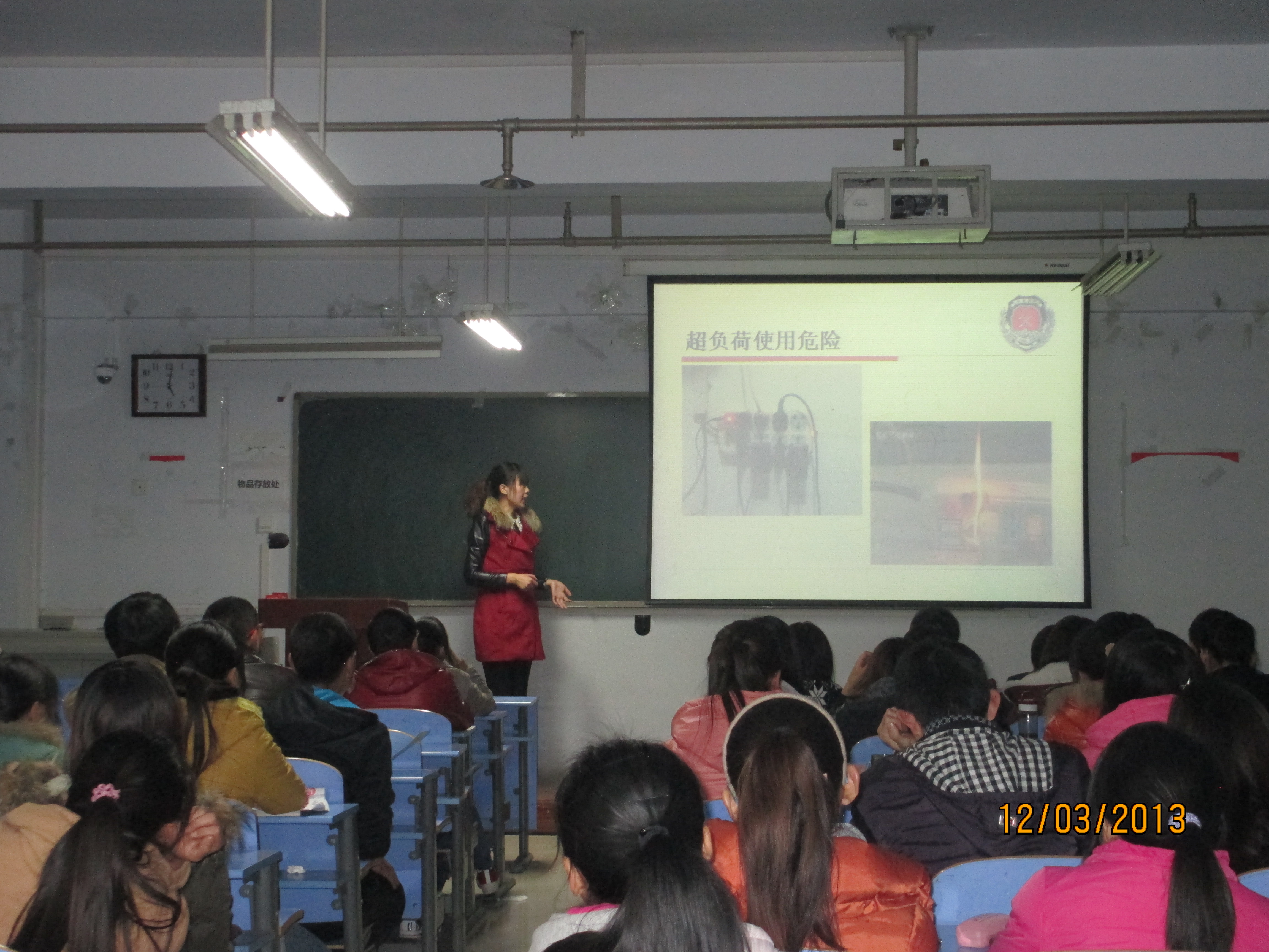 台露佳老师首先以东北三场大火开始了今天的讲座内容,在讲座中,她先向师生们讲解了我国近年来火灾的频繁发生率及带来的经济损失和人员伤亡,让大家在日常生活中懂得火灾的预防,提倡大家要养成“人走灯熄电停”的好习惯,要高度重视防火。之后还向大家讲解了起火逃生的方向、手段及如何使用灭火备用器材,列举了大家在生活中错误的逃生手段,最后在现场演示了防火设备的使用方法。