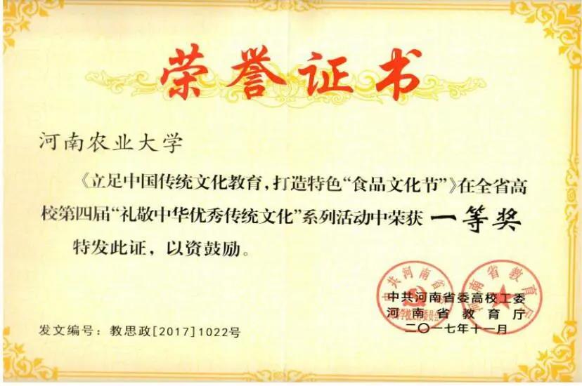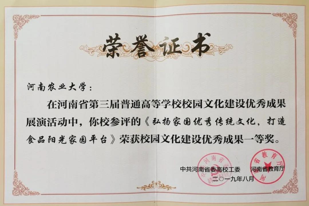 “食品阳光家园”育人工程以习近平新时代中国特色社会主义思想为指导,深入贯彻落实习近平总书记关于教育的重要论述,积极开展学生工作,全面落实立德树人的根本任务,曾荣获河南省第四届“礼敬中华优秀传统文化”一等奖并被推送到教育部,2019年荣获河南省全省高校思想政治工作优秀品牌、河南省高校校园文化建设优秀成果一等奖等嘉奖,已然成为高校思政育人工作的优秀载体。