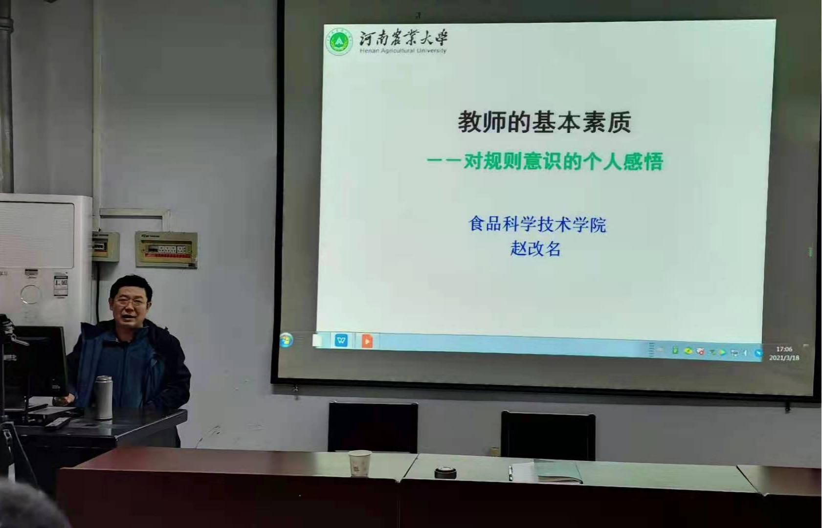 最后,院党委书记赵改名作师德师风报告,强调教师基本素质培养的必要性,并从教师的基本素质要求与规则意识、文化传承规则与教书育人义务、科学研究与学术规则、规则与创新的对立统一、坚决抵制与抨击潜规则等方面进行了探讨。老师们认真聆听,深受启发,纷纷表示要在今后的工作当中认真遵守师德师风,争当“四有”好老师。