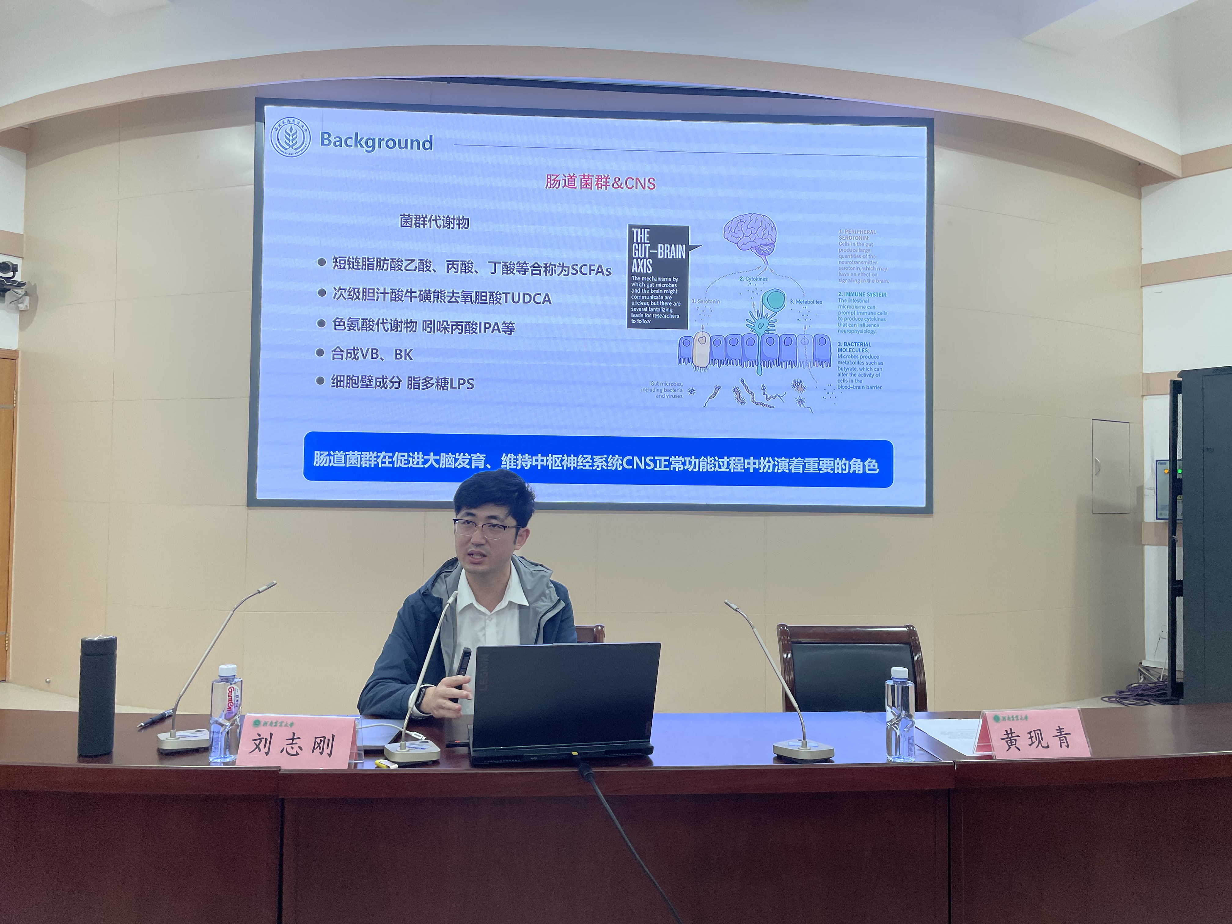 报告会上,黄现青院长向师生介绍了刘志刚教授的个人简历及主要科研成果,并对刘教授的到来表示热烈的欢迎。刘教授首先介绍了孕前肥胖的危害性,指出母代肥胖不仅影响母亲自身健康,同时是后代疾病起源的重要影响因素。随后,刘教授分享了课题组的一系列相关研究,指出母代孕前肥胖与子代学习、社交能力下降密切相关,动物研究显示母代膳食纤维干预能够缓解肥胖母亲产后抑郁,并改善了母带肥胖诱导的子代神经发育问题。进一步探究机制发现,膳食纤维是通过影响肠道菌群影响子代认知、社交功能,肠道菌群的代谢物短链脂肪酸可能通过影响了剪接体功能影响神经小胶质细胞成熟过程,进而发挥保护作用。这些具有创新性和前瞻性的研究给师生们留下了极其深刻的印象。