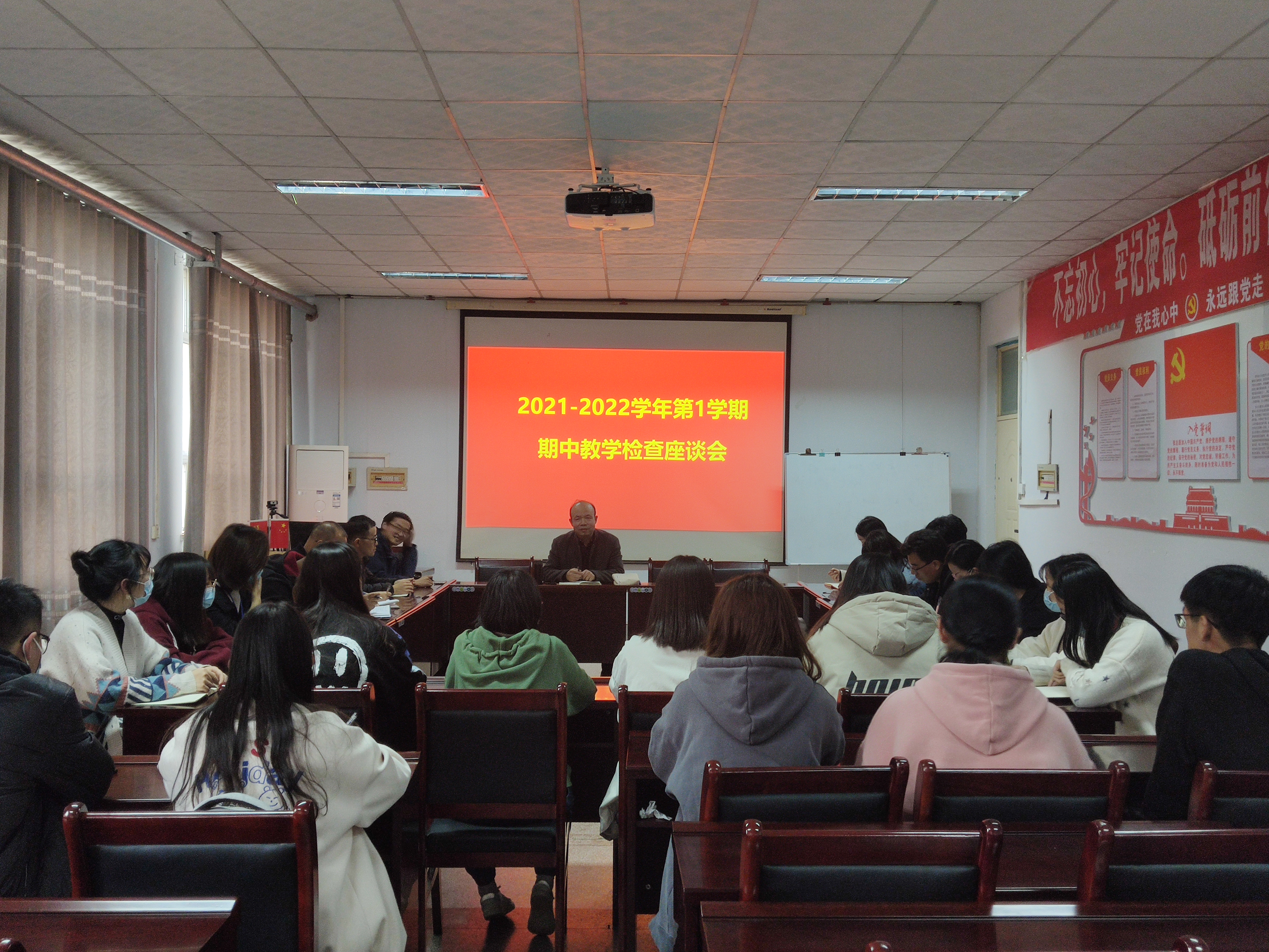 为推动2021-2022学年第一学期期中教学自查工作,特召开师生座谈会,参加会议的有教学院长张剑,任课教师代表、教学管理人员、中心实验室负责人、学生代表等。