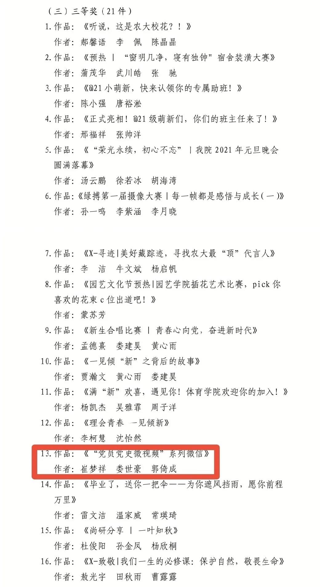 师生创作战“疫”歌曲<这里>》荣获二等奖,崔梦祥等人作品《“党员党史微视频”系列微信》荣获三等奖。