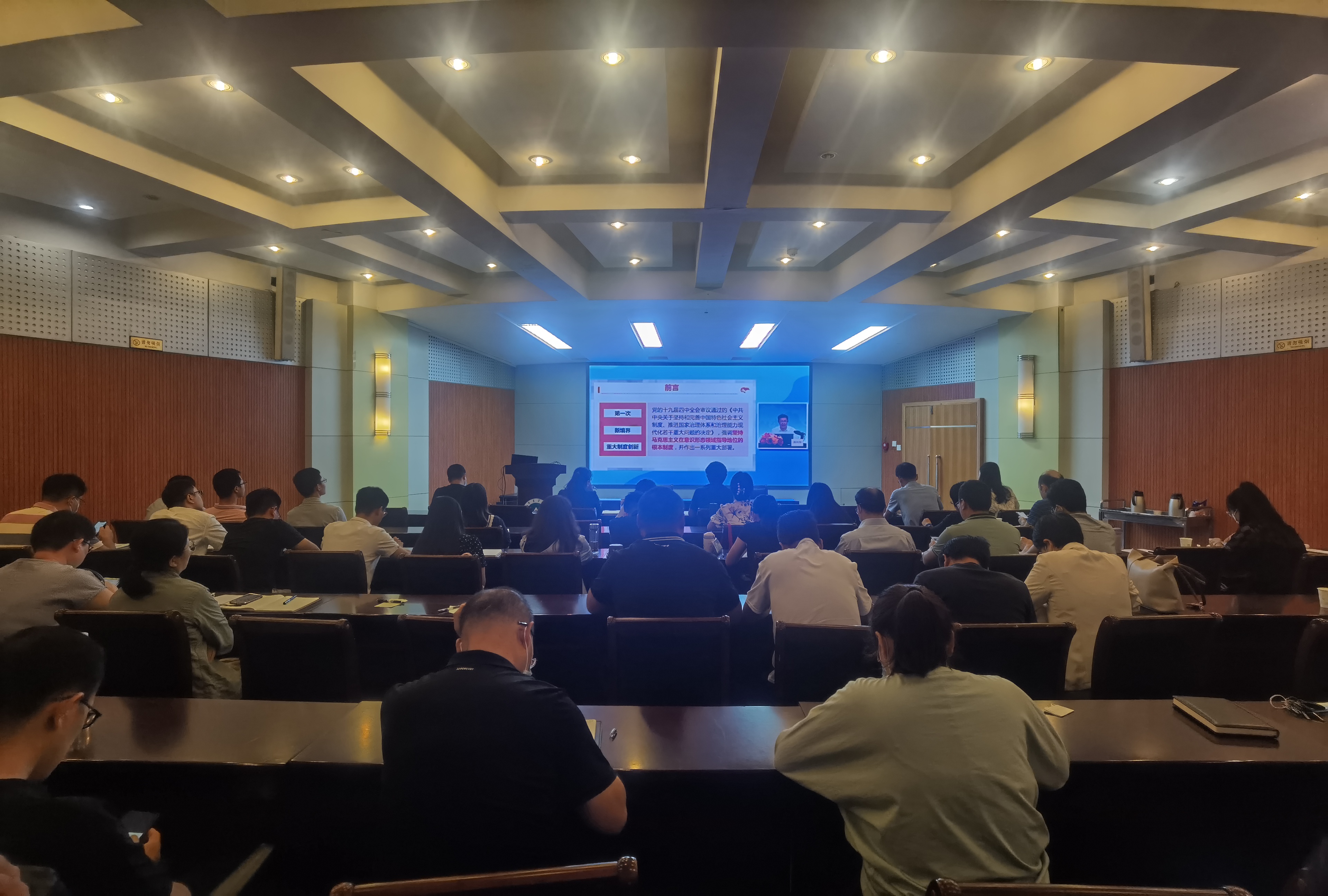 随后,全体教职工观看了中共中央党校督学洪向华,做的题为“坚持马克思主义在意识形态领域指导地位的根本制度,牢牢掌握意识形态工作领导权、管理权、话语权”的报告。报告教育引导广大教师坚持以人民为中心的导向,坚持马克思主义在意识形态领域的指导地位,为国家治理现代化提供保证。