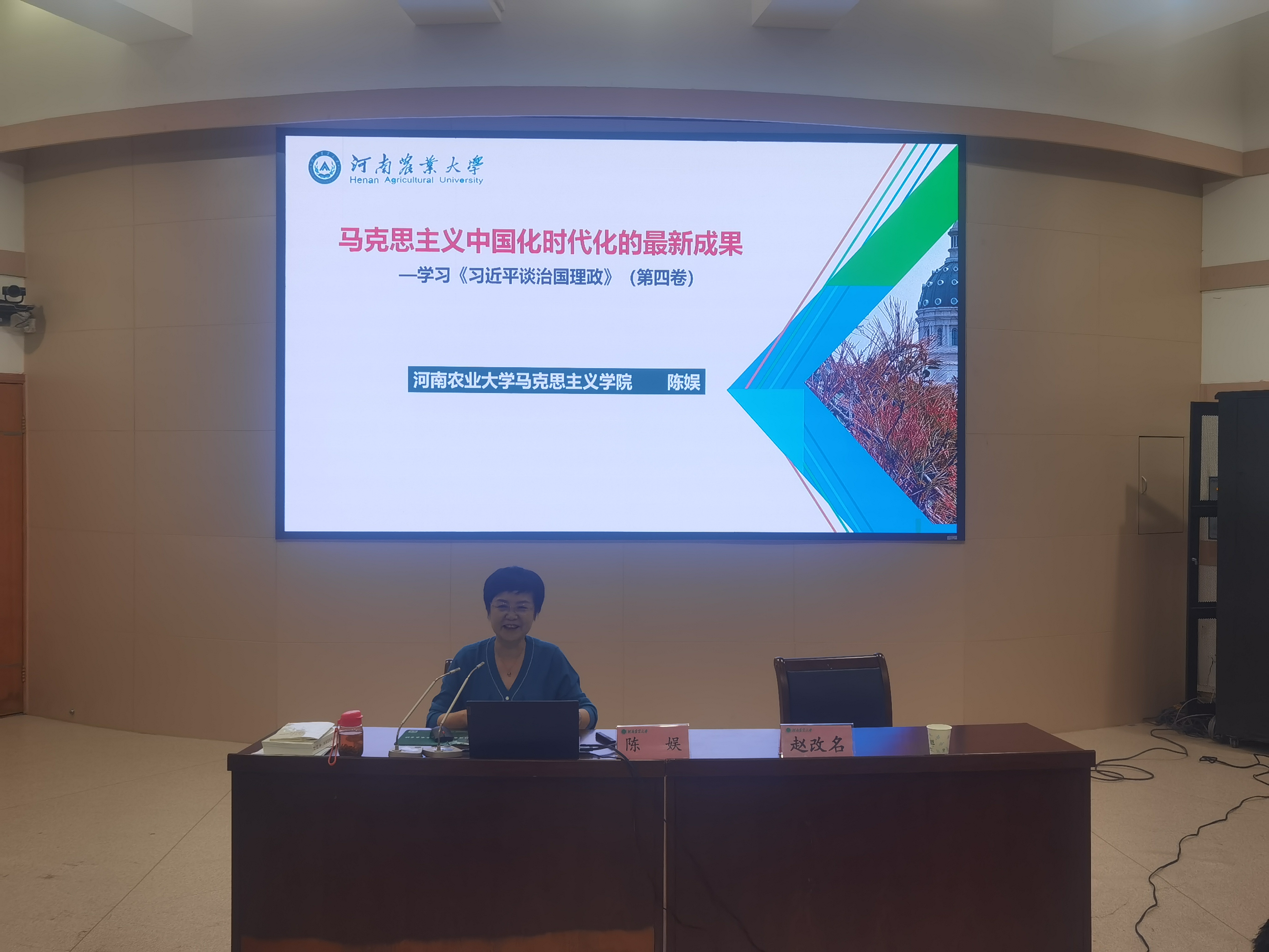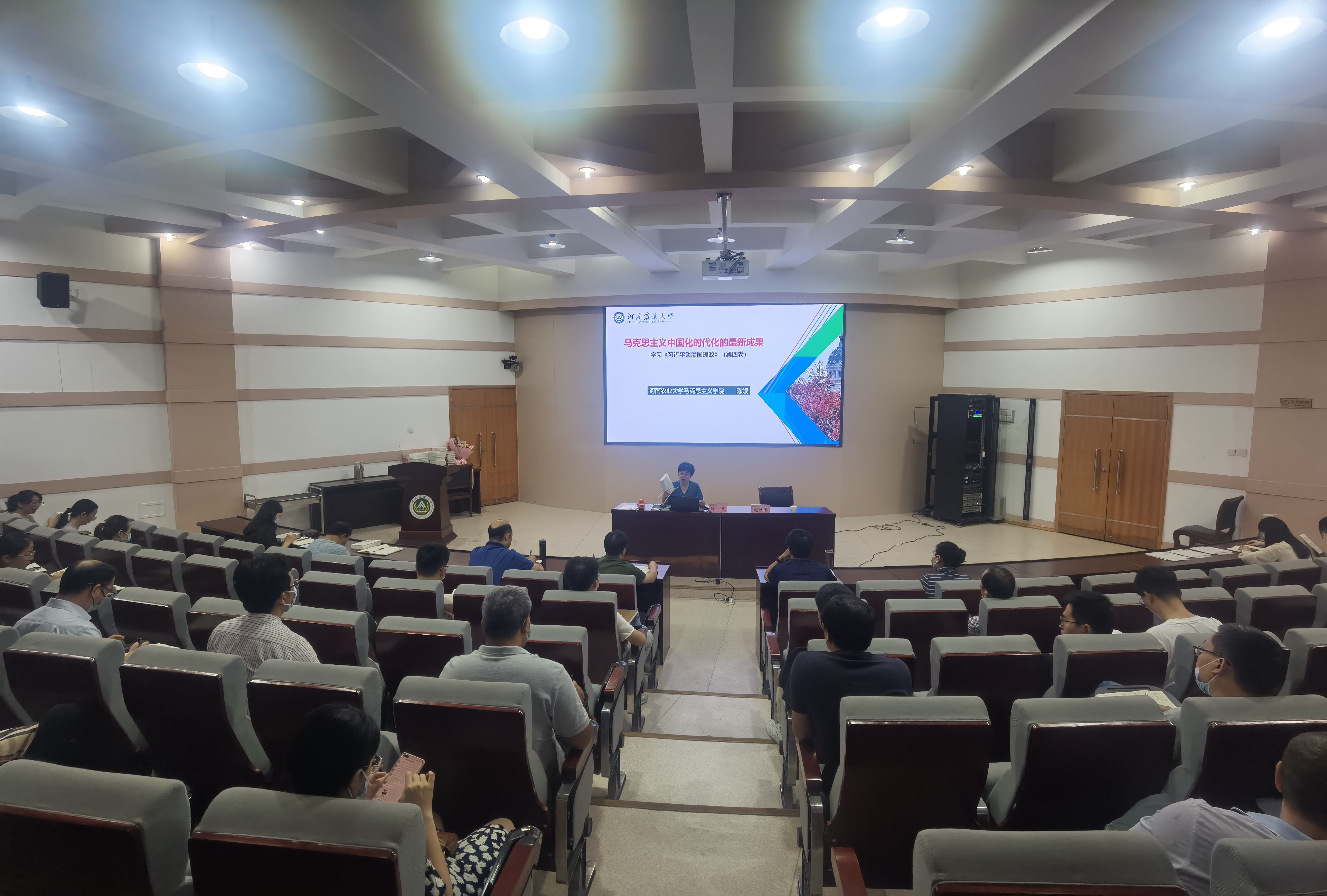 马克思主义学院陈娱教授围绕《习近平谈治国理政》第四卷为全体教师作专题辅导。她指出《习近平谈治国理政》第四卷生动记录了以习近平同志为核心的党中央面对百年变局和世纪疫情相互叠加的复杂局面、团结带领全党全国人民应变局开新局的伟大实践,汇集了一系列原创性的治国理政新理念新思想新战略,科学回答了“中国之问、世界之问、人民之问、时代之问”,深刻阐发了中国之路、中国之治、中国之理,集中展示了马克思主义中国化时代化的最新成果,为我们开启了“思想之窗”,指明了“致胜之道”,开辟了“复兴之路”,集中展现了马克思主义中国化时代化的最新成果,全面系统地反映了习近平新时代中国特色社会主义思想的新飞跃、新境界,为我们推动发展提供了科学指南、赋予了强大能量,我们应深学而笃行之。最后陈教授表示大家要把拥护“两个确立”、做到“两个维护”体现在岗位上、落实到行动中,不断提高政治判断力、政治领悟力、政治执行力,集中精力做好当前工作,以实际行动迎接党的二十大胜利召开。