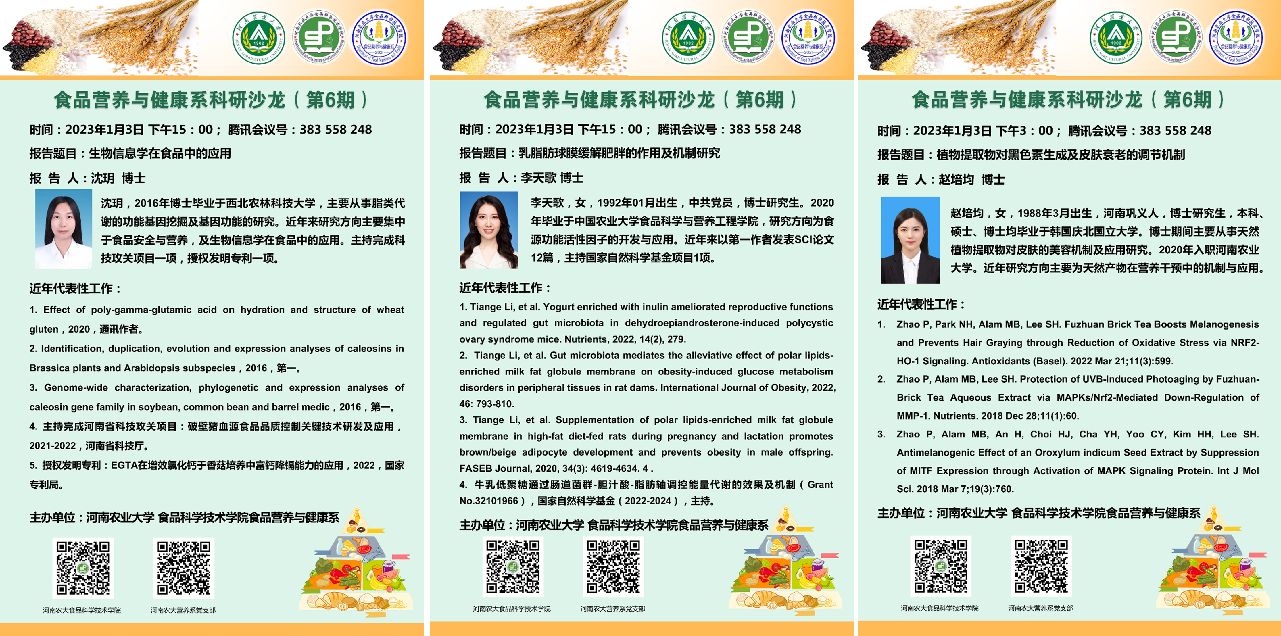 (通讯员闫爽)2023年1月3日,食品营养与健康系于线上举办了第六期“科研沙龙”系列学术交流活动。本次交流活动由李宁教授主持,沈玥、李天歌和赵培均三位博士进行了主题报告。