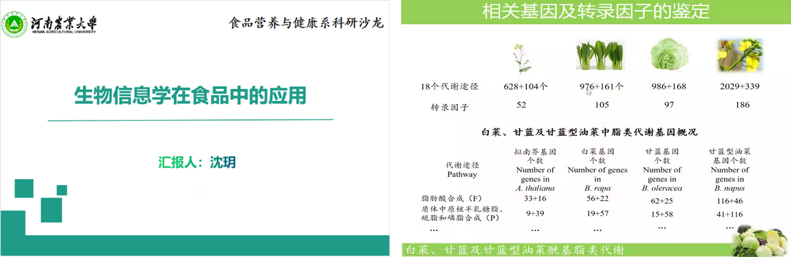 沈玥博士以“生物信息学在食品中的应用”为主题进行了报告。沈玥博士在基因组水平上研究了白菜、甘蓝及甘蓝型油菜中酰基脂类代谢及其调控机制,建立了脂类代谢基因数据库,并对油体钙蛋白基因家族进行了系统分析,为油料植物脂类代谢基因的深入研究提供了借鉴。另外,沈玥博士还从生物信息学的角度介绍了热胁迫时嗜热脂肪地芽孢杆菌芽孢形成相关基因的表达以及核桃花对高血压的调控作用。