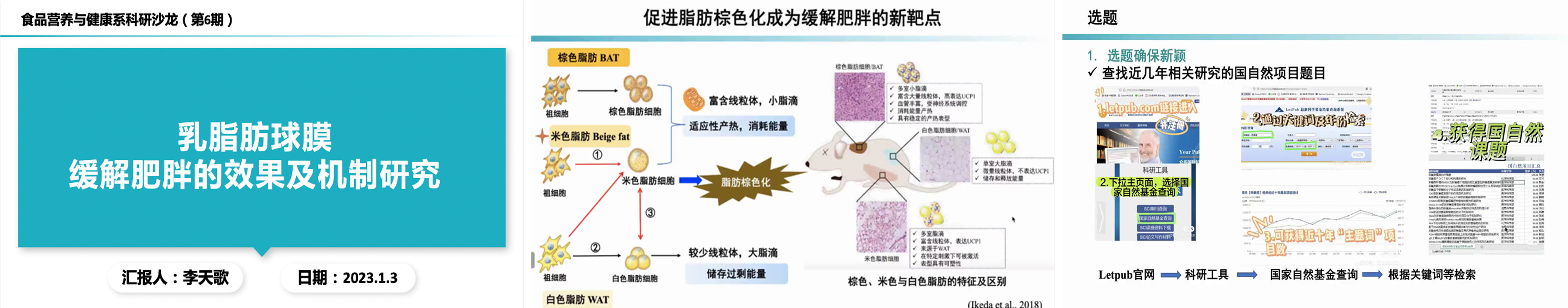 李天歌博士的报告以“乳脂肪球膜缓解肥胖的作用及机制研究”为主题展开。李天歌博士的研究围绕脂肪细胞棕色化,利用多种细胞和动物模型,深入探究了乳脂肪球膜(MFGM)缓解肥胖的作用效果及其机制,为食源性活性成分抗肥胖新产品的开发寻找新资源,为功能性乳基料的开发提供理论依据与科学基础。此外,李天歌博士还从选题、基金写作、申报方向选择等方面向参会师生介绍了基金申报需要注意的相关问题,并分享了基金撰写的经验和心得体会。