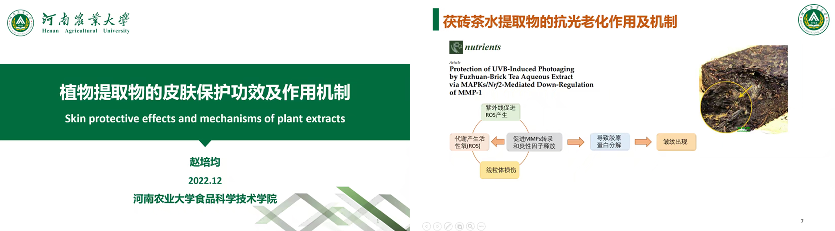 赵培均博士以“植物提取物对黑色素生成及皮肤衰老的调节机制”为主题进行了报告。紫外线对皮肤的刺激会使皮肤产生氧化损伤,造成皮肤衰老和黑色素的生成及过度沉着或丧失。赵培均博士向参会师生详细介绍了茯砖茶和睡莲等提取物的抗光老化、美白以及抑制头发变白的功效及机制,其研究表明天然植物成分不但能够增强抗氧化机制,并且能够调节黑色素合成关键酶,对于天然植物成分在美白或乌发产品中的应用具有重要参考意义。