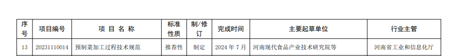 潘治利教授牵头、雷萌萌副教授主要参与的《预制菜加工过程技术规范》获批立项。