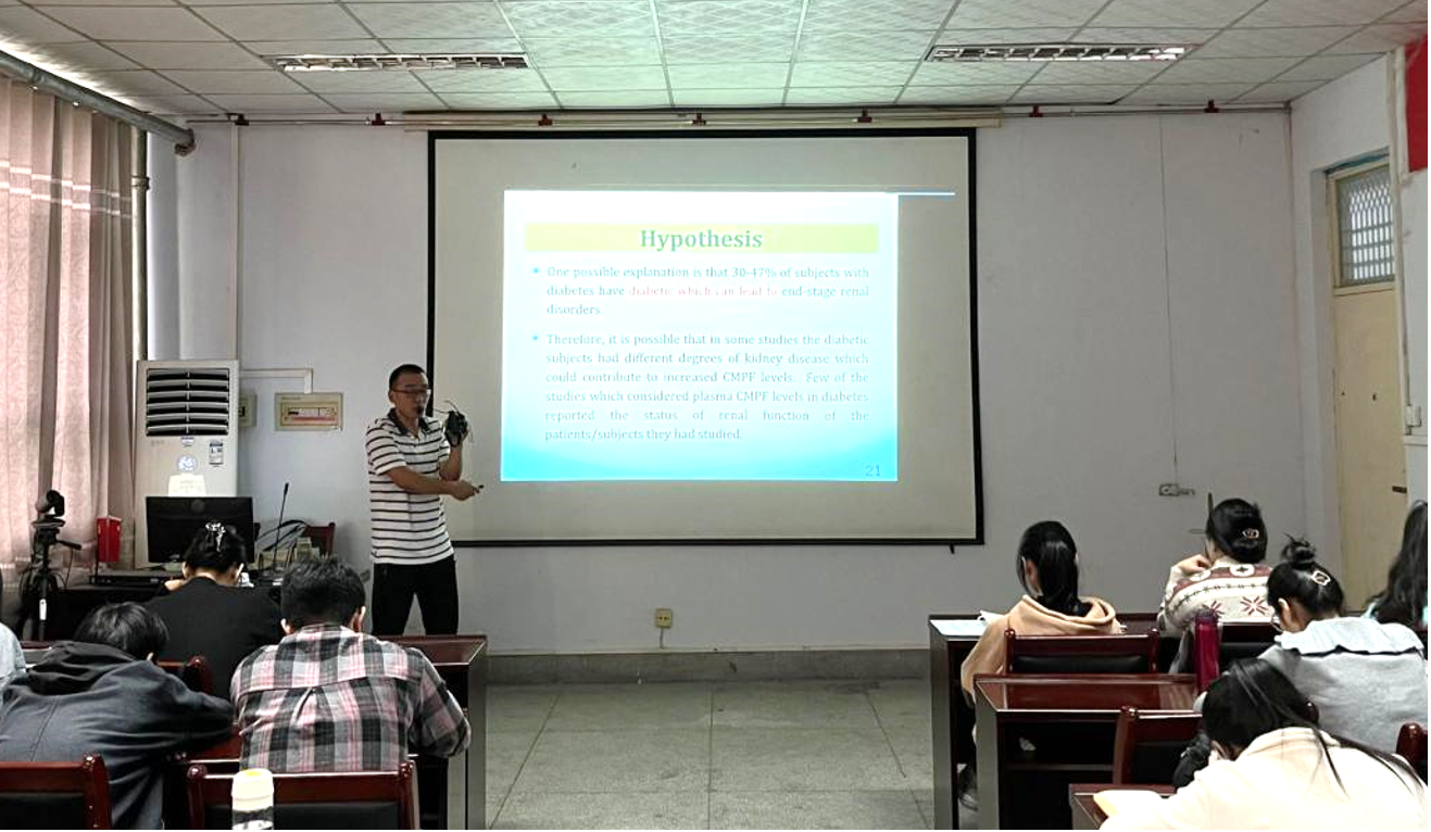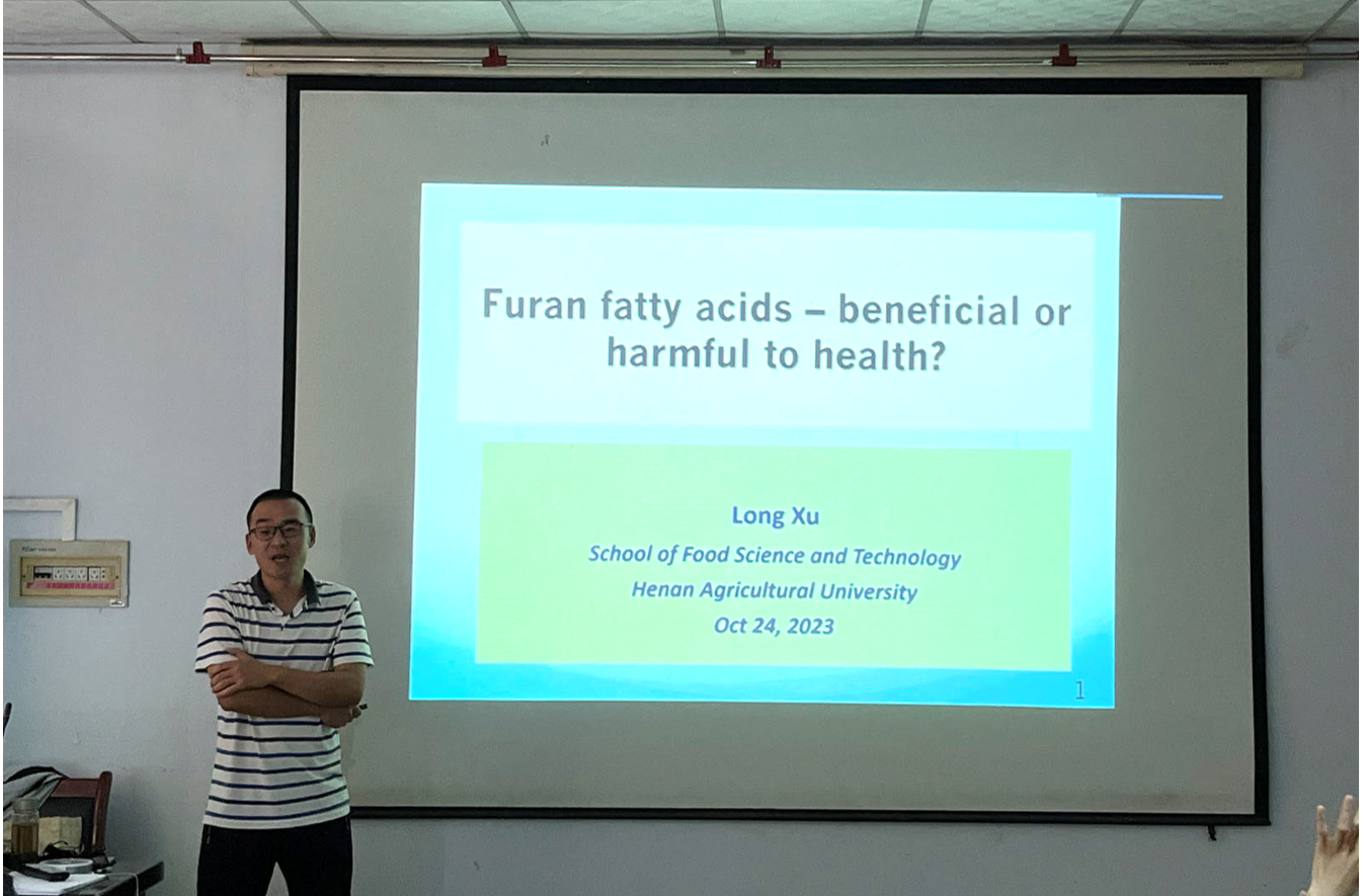 许龙博士深入讲解了呋喃脂肪酸存在于哪些食品当中、对人体是否有害,并且向在场研究生科普了先进质谱技术在食品安全检测方面的应用。许龙博士严谨的科学态度、扎实的学术研究功底为在场研究生打开了一扇新的选题之窗。