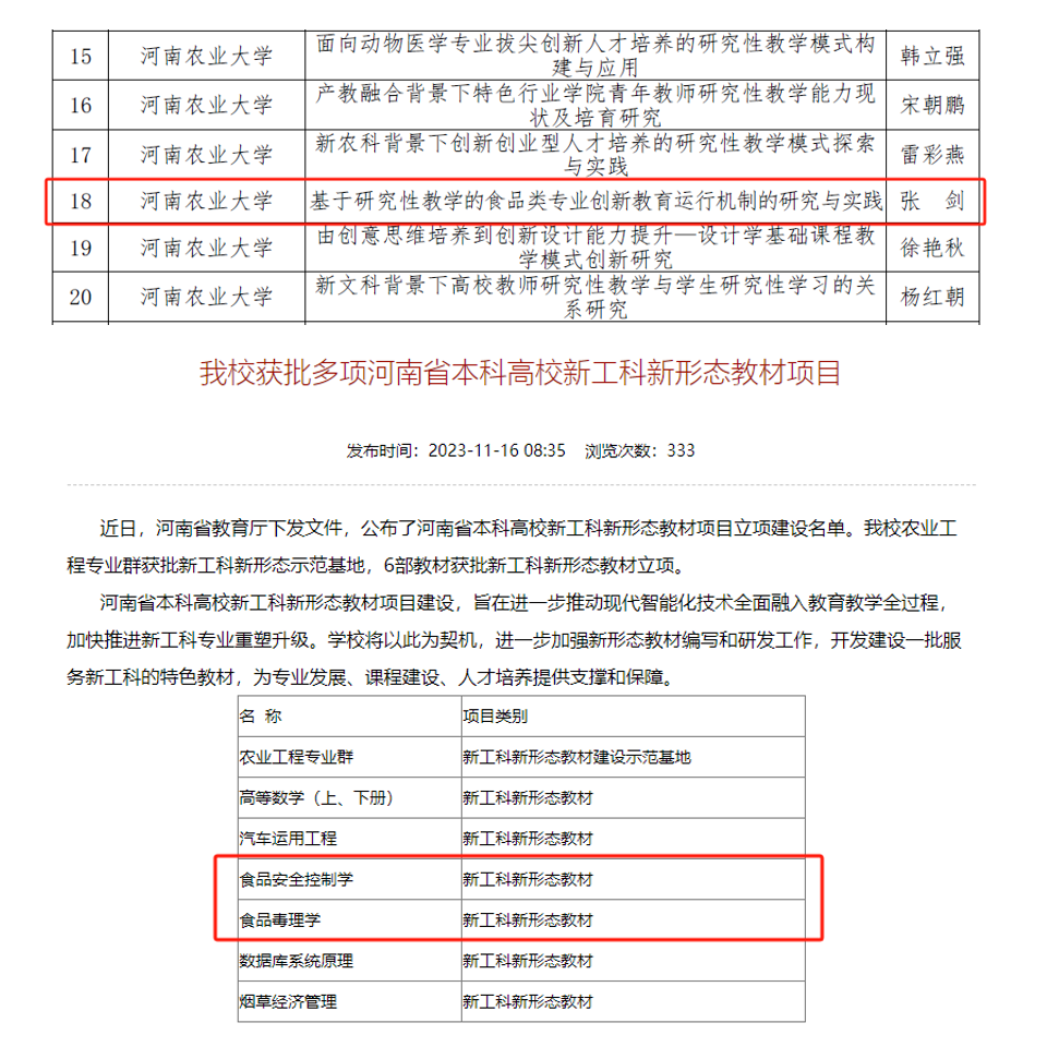 学院获批河南省研究性教学改革项目1项,河南省教育科学研究项目1项,河南省创新型人才培养典型案例1项,与河南天香面叶食品有限公司共建河南省本科高校大学生校外实践基地项目1项。获批百合小说 揭榜挂帅项目1个、重点项目2个、青年项目11个。《食品安全控制学》、《食品毒理学》获批河南省本科高校新工科新形态教材项目。百合小说 教师主编、参编教材10余部,发表教改论文30余篇。