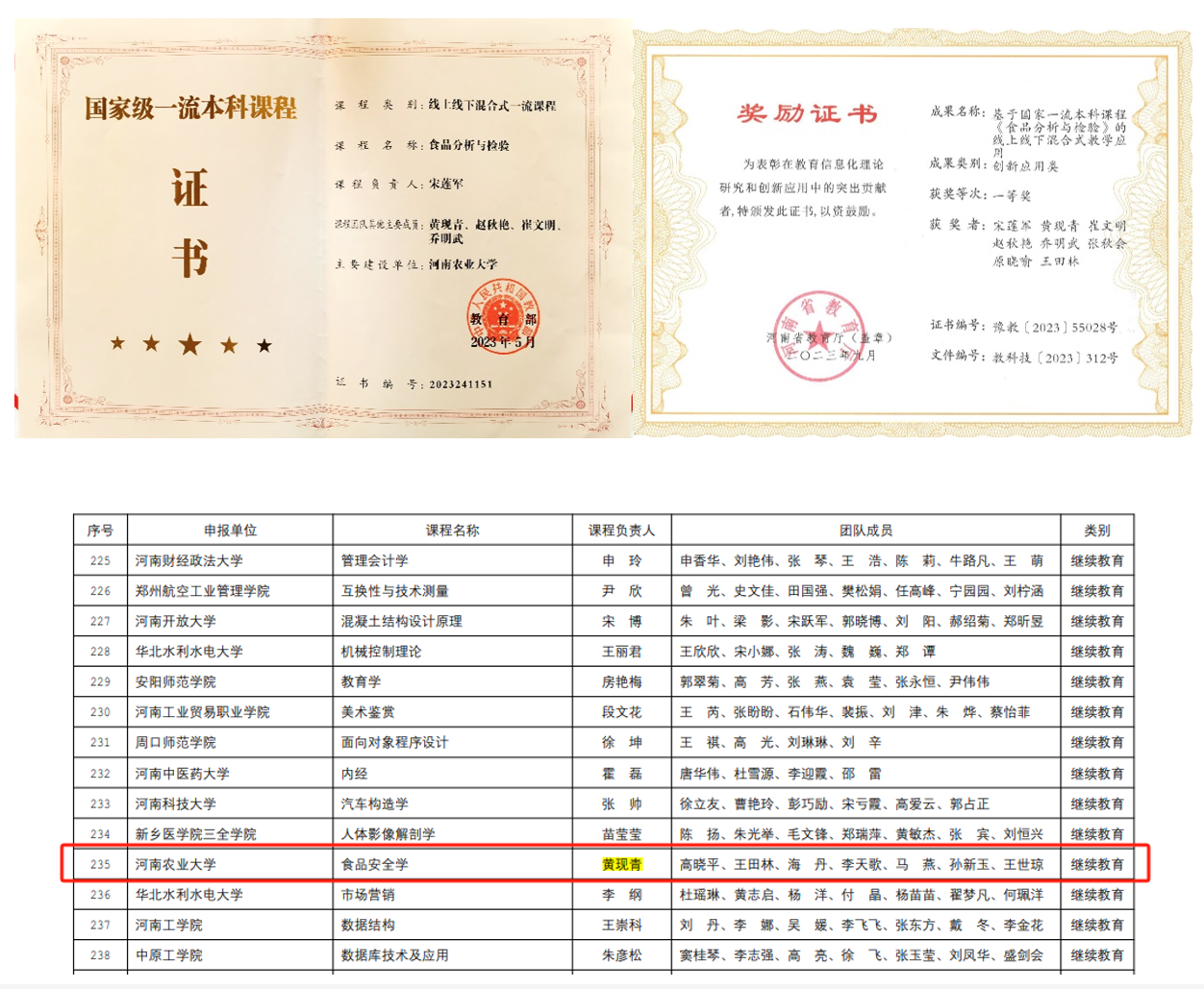 2023年,学院全力支持开展课程建设,多项课程获批课程建设项目。其中《食品分析与检验》获批国家级一流本科课程,《食品工艺学》获批河南省“专项融合”特色示范课程,《食品添加剂》获批河南省一流本科课程和研究性教学示范课程,《食品安全学》获批河南省继续教育课程思政示范课,《认识实习》等6门课程获批百合小说 校级课程思政示范课、“专创融合”特色示范课、线上线下混合式一流本科课程、社会实践一流本科课程,《食品安全控制学》等3门课程获批为校成人高等教育精品在线开放课程。