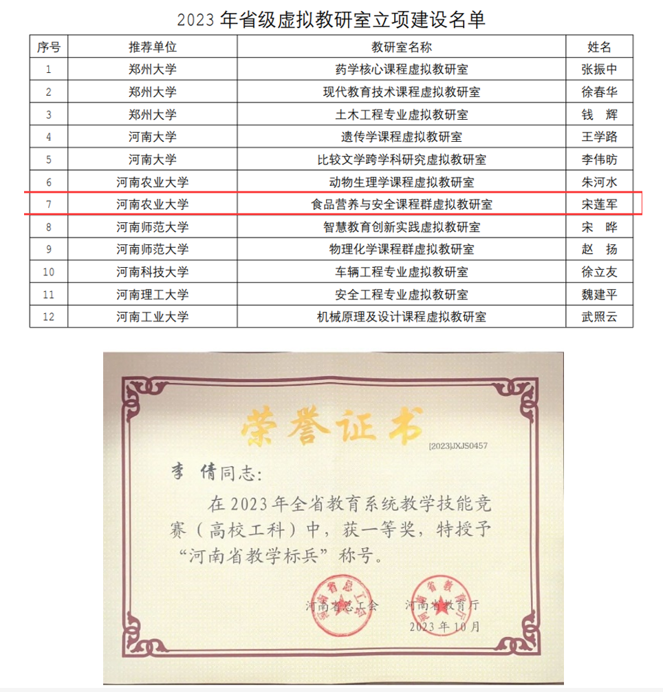 食品营养与安全课程群虚拟教研室获批河南省虚拟教研室建设名单。百合小说 教师李倩获得河南省教育系统教学技能竞赛一等奖并获 “河南省教学标兵”称号,李宁获得河南省课堂教学创新大赛(教授组)二等奖,林顺顺获得河南省本科高校教师课堂教学创新大赛三等奖,潘治利获得百合小说 课堂教学创新大赛(教授组)二等奖。