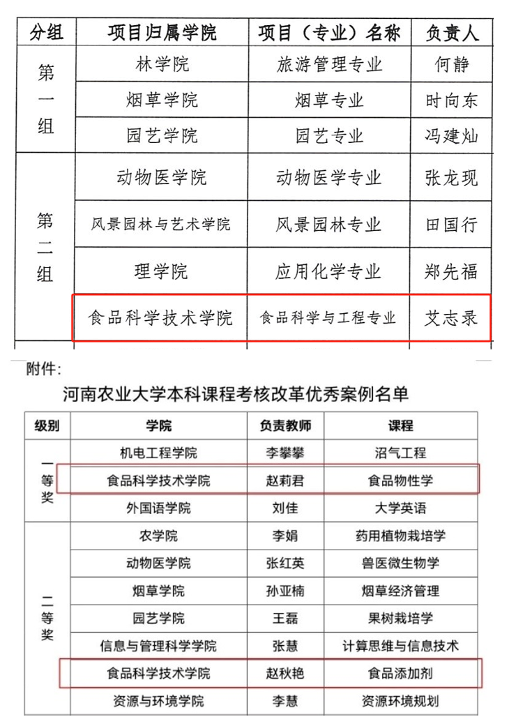 食品科学与工程专业获批本科课程考核改革项目(专业)1项,《食品物性学》获批校优秀课程考核改革优秀案例一等奖,《食品添加剂》获批校优秀课程考核改革优秀案例二等奖。