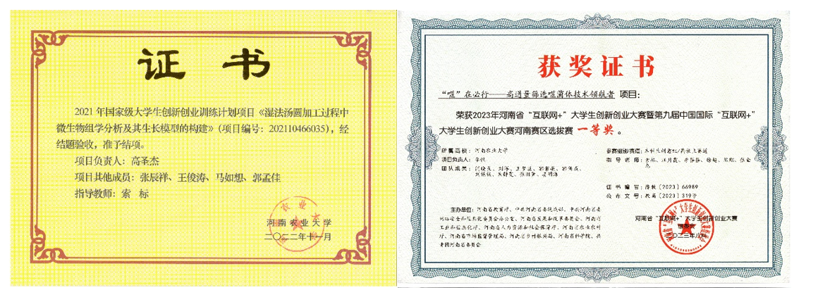 获批“大学生创新创业项目”22项,其中国家级项目4项,省级项目1项。获“互联网+大赛”国家铜奖1项,省级一等奖3项,二等奖3项,三等奖2项。获“挑战杯”省二等奖1项,大学生生命科学竞赛等其他相关奖励20余项。