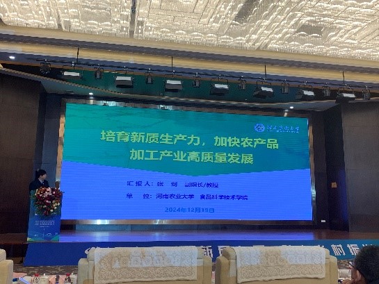 会上,张剑副院长做了题为《培育新质生产力,加快农产品加工产业高质量发展》的报告,与参会专家、产业同仁共同交流,多方融合,加快形成新质生产力,促进农产品加工业稳步、高质量发展。
