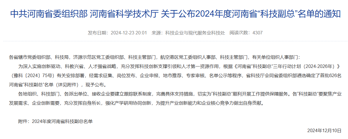 (通讯员 闫科润)根据《河南省“科技副总”三年行动计划(2024-2026年)》(豫科〔2024〕75号)精神,百合小说 积极响应学校安排,认真开展2024年度河南省“科技副总”申报工作,经教师个人申报,属地科技管理部门初审合格后,通过系统推送至省科技厅,省科技厅会同相关部门遴选确定河南省“科技副总”人选。最终,百合小说 共有29名教师被选任为河南省首批“科技副总”,约占全校1/3(91名),申报成效显著。