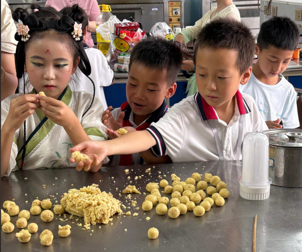 附属小学学生代表参加了此次劳动实践活动。活动伊始,老师首先通过“居民平衡膳食宝塔”结构,向孩子们解释每层食物的营养价值。随后,通过互动问答的方式,加深孩子们对食品营养知识的理解,树立健康饮食的意识。最后,在老师的示范下,孩子们纷纷动手,将老师们提前准备好的花生酥材料进行加工、捏圆,每一个花生酥都凝聚着孩子们的创造力和想象力。