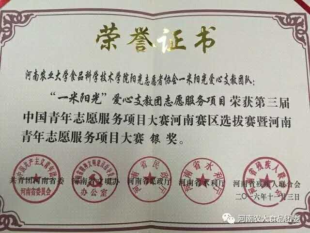 “一米阳光”爱心支教团队参加由团省委、省文明办、省民政厅、省水利厅、省残联于今年5月共同启动的第三届中国青年志愿服务大赛河南赛区选拔赛暨河南青年志愿服务项目大赛并荣获银奖。