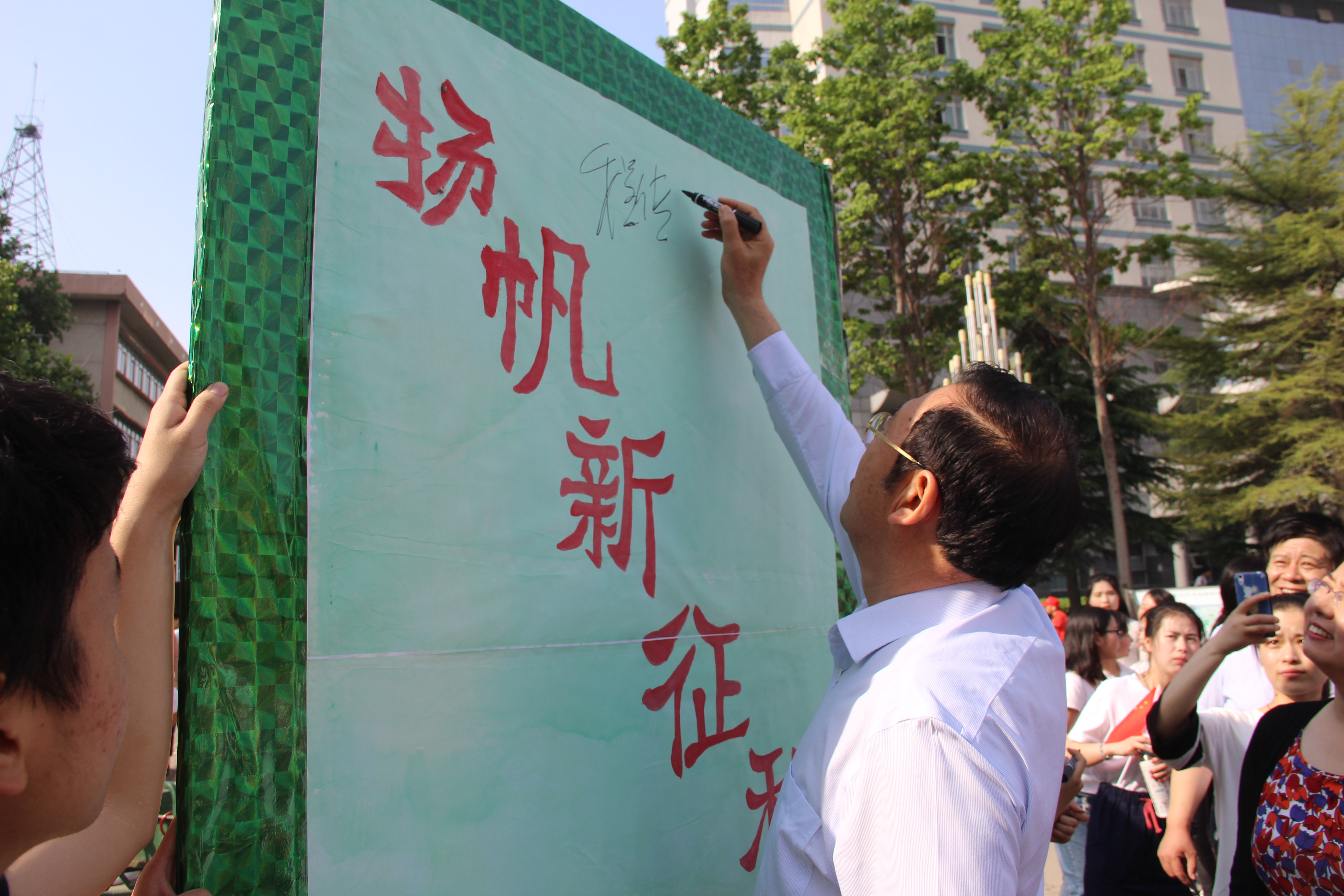 活动当天,学院全体毕业生迎着朝阳,手举小红旗,朗诵《少年中国说》,他们声音洪亮、响彻云霄,以铿锵有力的气势,充沛饱满的感情,展示出食品学子的爱国热情与昂扬向上的精神风貌。随后,毕业生们提议一起唱校歌,熟悉歌声传遍校园每个角落,表达出他们对农大的深深不舍与感恩之情。此外,学校、学院领导老师还在“感怀农大情,扬帆新征程”展板上签字、写寄语,祝愿学院毕业生在新的人生征程中积极创新创业,为食品争光添彩。