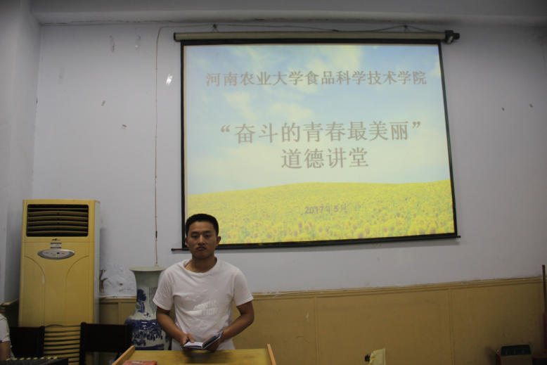 本次道德讲堂从唱歌曲、看短片、讲故事、送祝福、感悟交流、诵读经典、提倡议以及作总结八个方面进行讲述。其中主要以曹涛分享大学生活经历为主,他简单介绍了自己在日常生活中的表现,以及曾作为学院阳光志愿者协会会长的感悟与收获。他认为像志愿服务活动、支教经历等诸多公益事情,会潜移默化的影响自己的心灵境界,在不知不觉中提升自身的道德感与责任感,希望在座的同学们都能从小事做起,从点滴做起,积极地帮助他人,形成“我为人人,人人为我”的良好风气。讲座最后,张世昌号召与会全体同学学习“大爱精神”,传递社会正能量,引领道德新风尚。