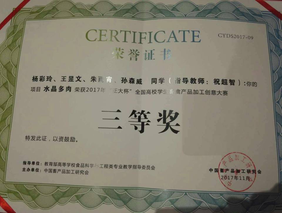 “水晶多肉”学生团队参加由教育部高等学校食品科学与工程类专业教学指导委员会指导,国家一级学会中国畜产品加工研究会主办的2017年“正大杯”全国高校学生畜禽产品加工创意大赛并荣获三等奖。