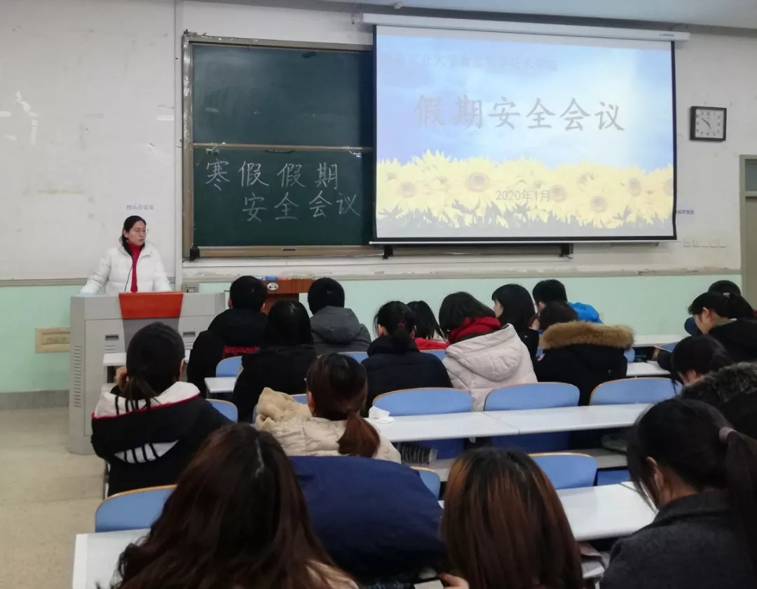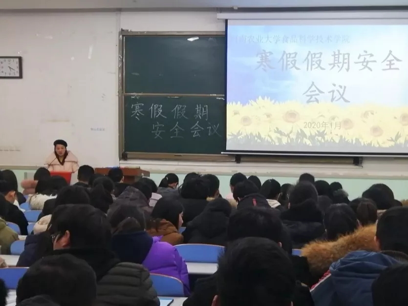 在文化路校区工程楼102教室召开寒假安全工作会议。院团委书记李蓓蓓、院辅导员黄姗姗出席会议,17、18、19级全体学生参加会议。