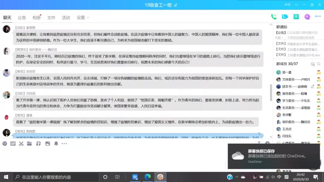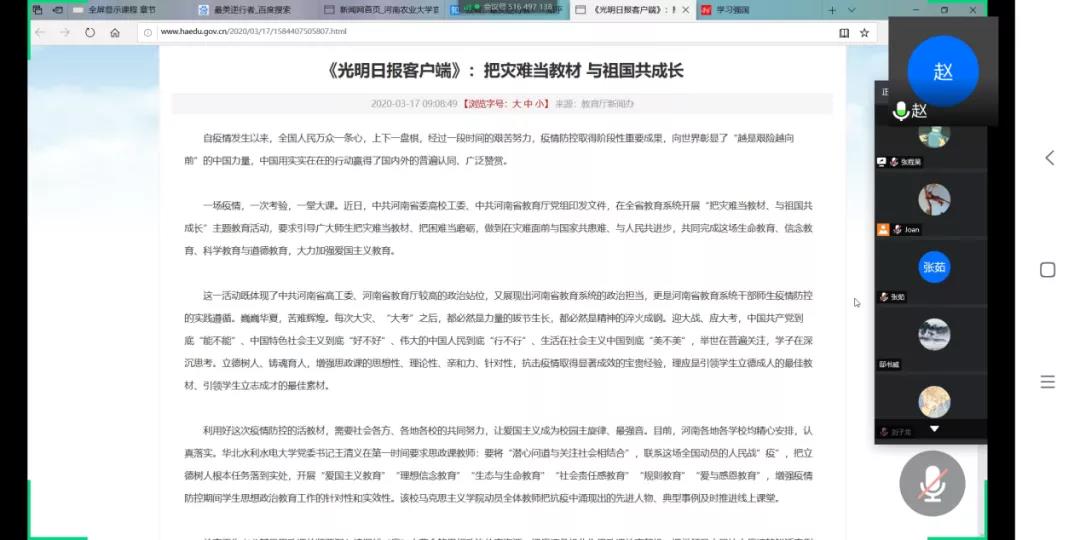 随后,各班级开展以“把灾难当教材 与祖国共成长”为主题的班会,通过网络学习最美逆行者优秀事迹,哀悼民族英雄;并邀请担任过抗疫志愿者的同学进行发言。最后,同学们表示会学习身边的“最美逆行者”和先进典型的精神,保持昂扬向上的精神面貌坚定、战胜疫情的信心,做好自学工作,高效高质完成各项学习科研任务。