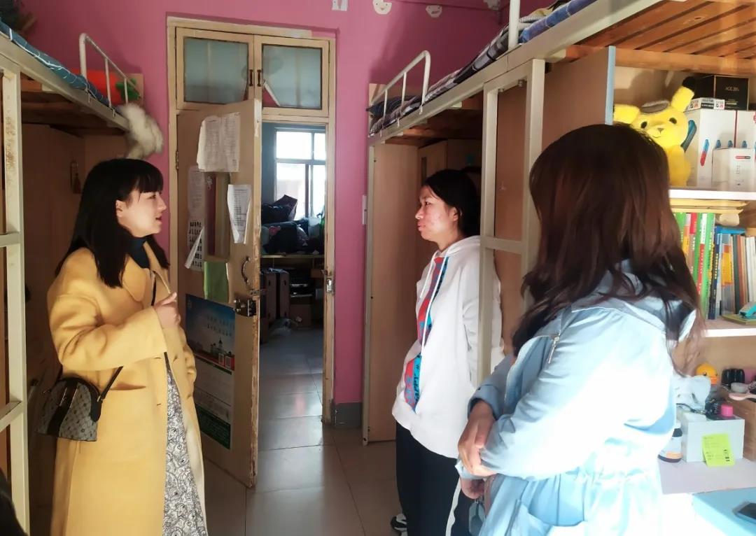 老师黄姗姗、胡梅走访大四学生宿舍,看望即将考研的同学。