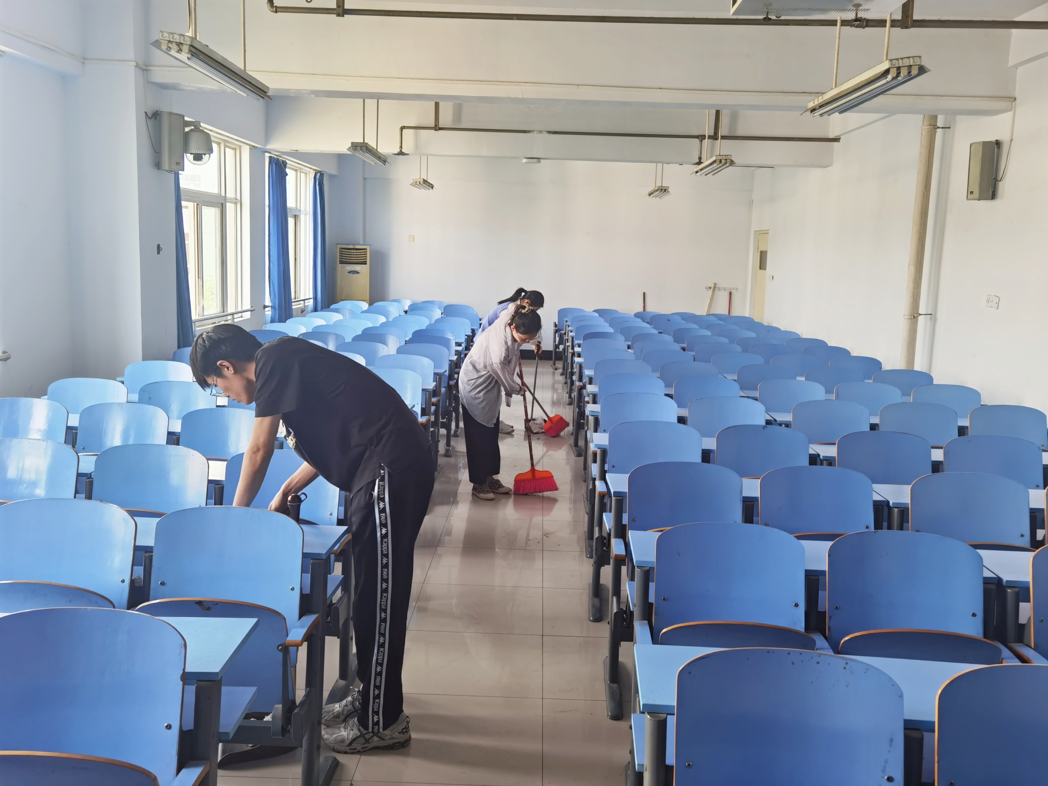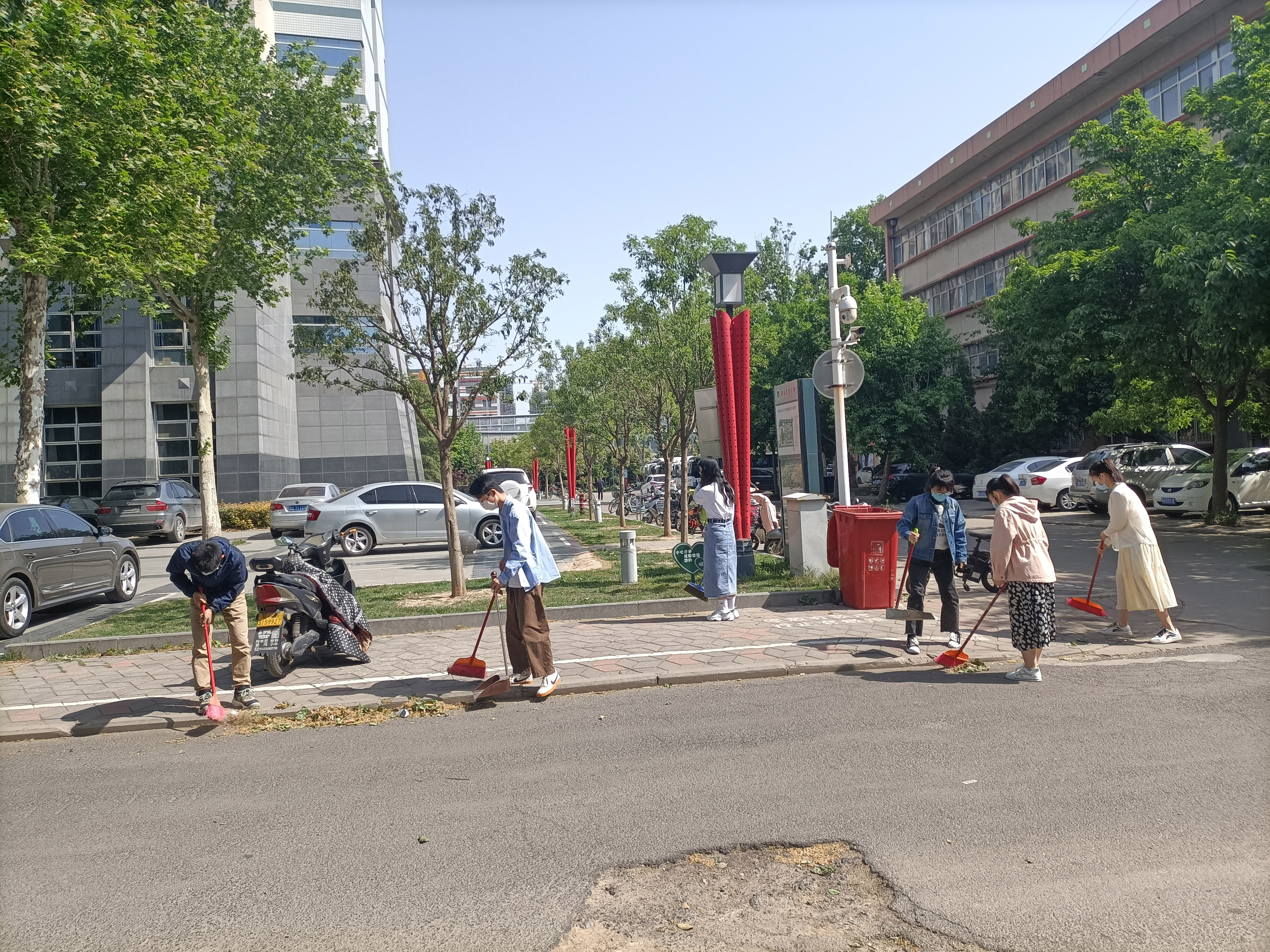 留校学生党员手握工具清扫了校园里的垃圾和枯树枝,整齐摆放自行车和水壶,并打扫了学习教室。大家一丝不苟,以极大的热情投入活动,为校园增添一抹“亮色”。以党建带团建,学院团员也在当天为环卫工人和门卫送上饮品和祝福。参加活动的党员纷纷表示本次党日活动不仅提升了党性修养,也为城市文明和绿色校园的建设作出了一份贡献。