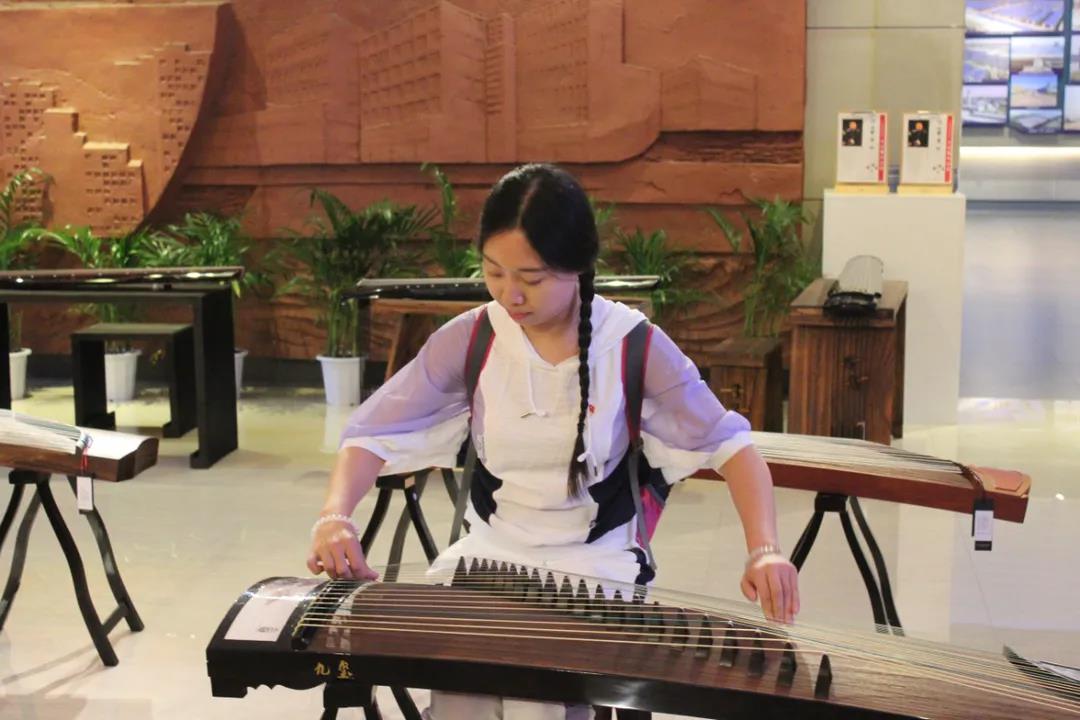 师生来到红色文创展厅,大家参观了一系列红色文化纪念品、以兰考县特色泡桐木制成的古筝引起了大家的兴趣,路平老师现场即兴演奏古筝乐曲,丰富了实践团此次兰考之行。