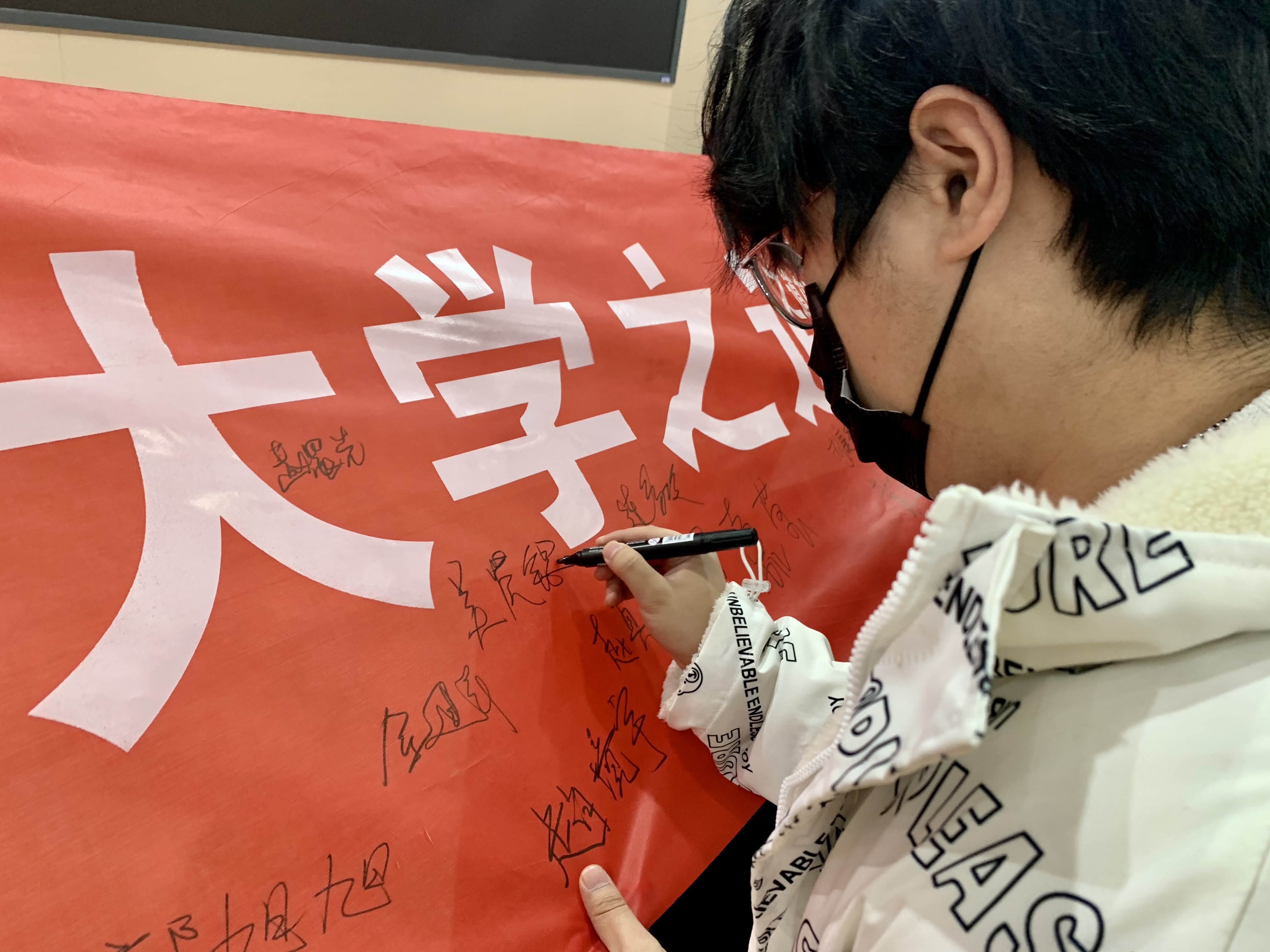 最后,同学们在“大学之道在于明德,考试之道在于平时”横幅上签上自己的姓名并纷纷表示自己会信守承诺,诚信应考。