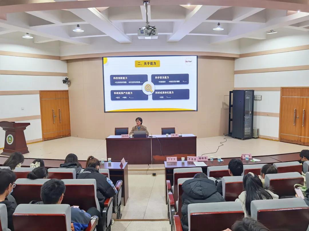 赵莉君分别从学业、能力、未来等方面分享了自身体会和感受,对同学们提出了三点要求,一在学业方面,要学会课程学习与实践锻炼相结合,加强自身的知识储备,认真对待每一次实训机会;二在能力方面,要注重科研素能的培养,强化科技创新、科学普及、成果产出、成果转化四个能力;三在未来的学习生活中,要有更加长远的学习规划,树立远大理想目标。