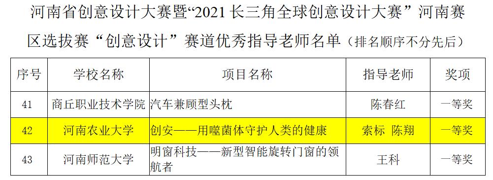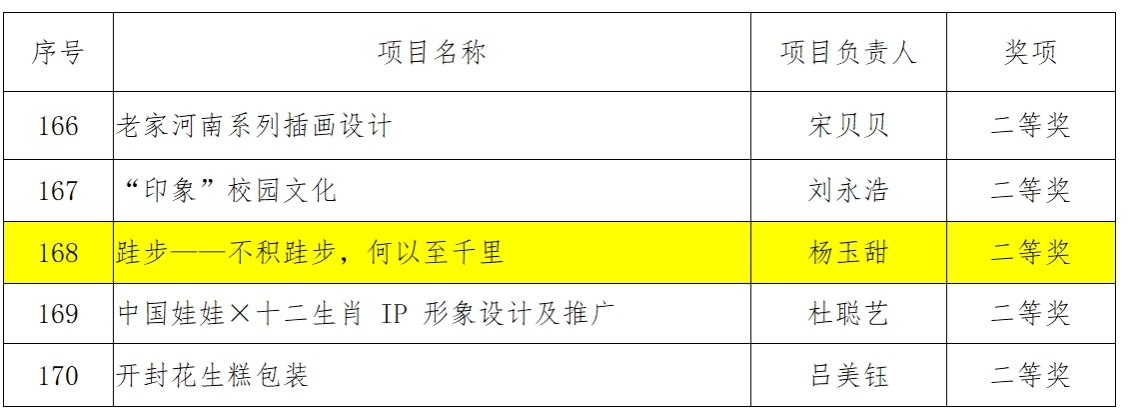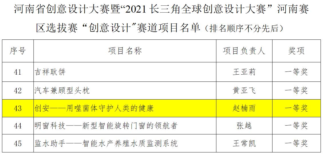 《创安--用噬菌体守护人类的健康》项目组喜获“创意设计”赛道一等奖,项目负责人为19级食检一班赵楠雨;《跬步--不积跬步,何以至千里》项目组喜获“创意设计”赛道二等奖,项目负责人为20级食工二班杨玉甜。