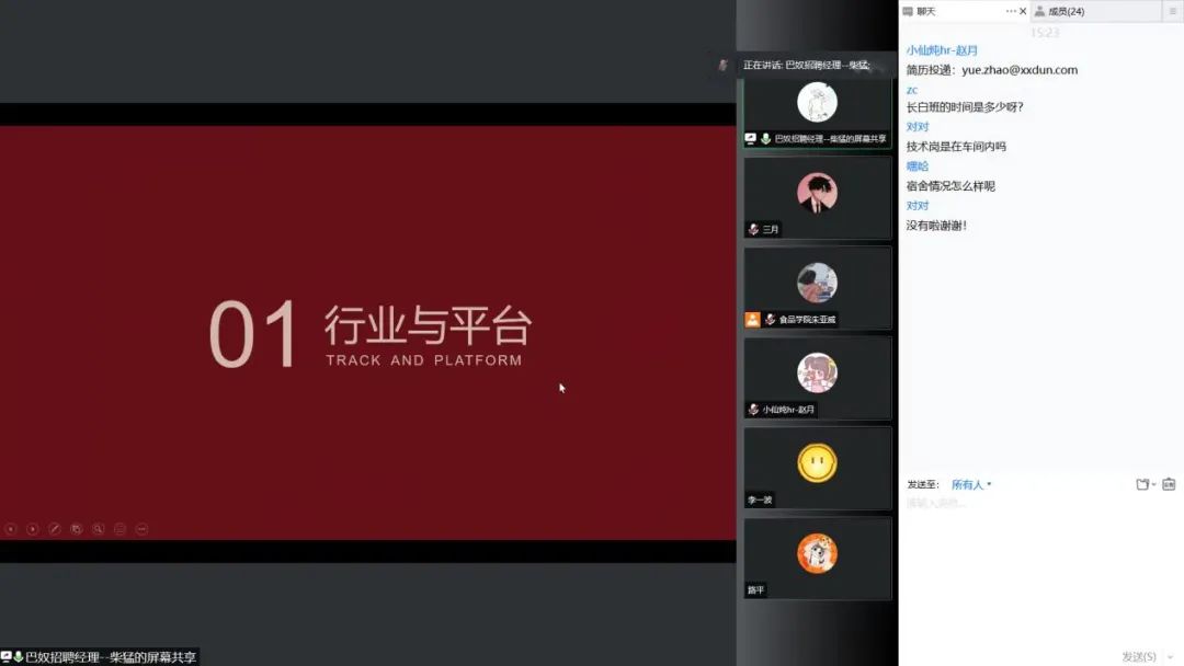 互动环节,赵月和柴猛都详细地回答了同学们的提问,对同学们关心的问题进行一一解答,并鼓励同学们积极投递简历。