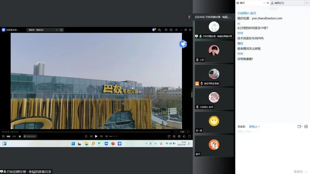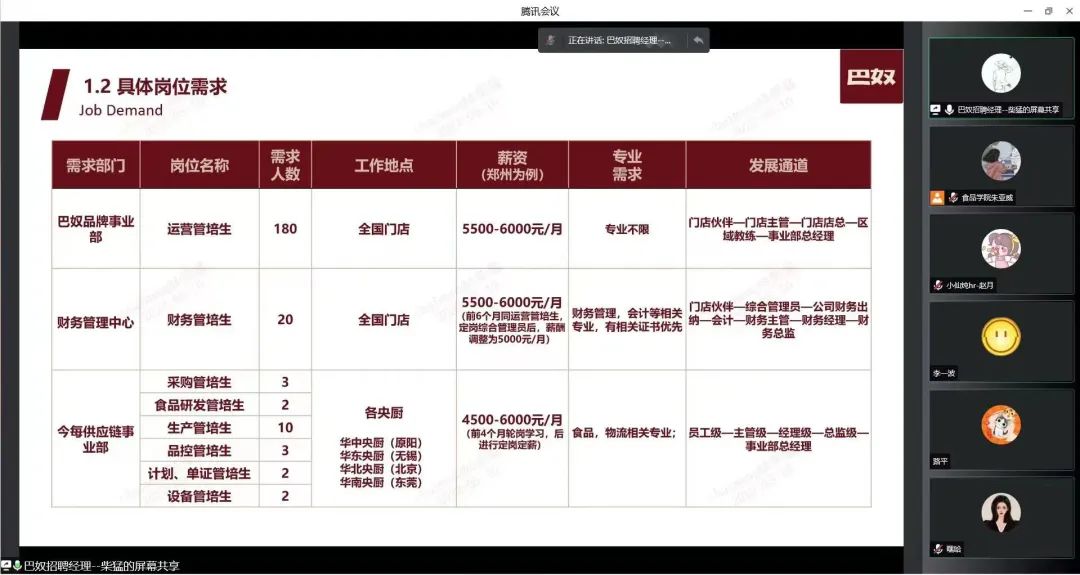 随后巴奴毛肚火锅有限公司的HR柴猛参与连线。柴猛通过播放企业宣传片向同学们展示了巴奴公司的成长、发展与未来规划,通过PPT向同学们详细地介绍了目前巴奴的优势、巴奴的员工福利、巴奴在公益方面的作为。同时,也为同学们讲述了加入巴奴后的晋升路线,使同学们对自己加入巴奴后有进一步规划。他表示,巴奴需要的是积极进取、热爱学习、行动力强、有创造力的人才,公司会给进取者提供充满挑战性的成长空间和定制化的培养方案。