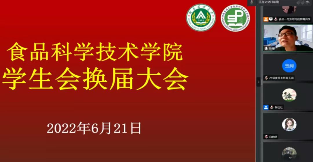 于线上形式召开学生会换届大会。院团委书记路平,院团委副书记陈翔,院辅导员张金龙、王晓杰,院学生会全体成员以及20、21级各班学生代表共140余人参加会议。