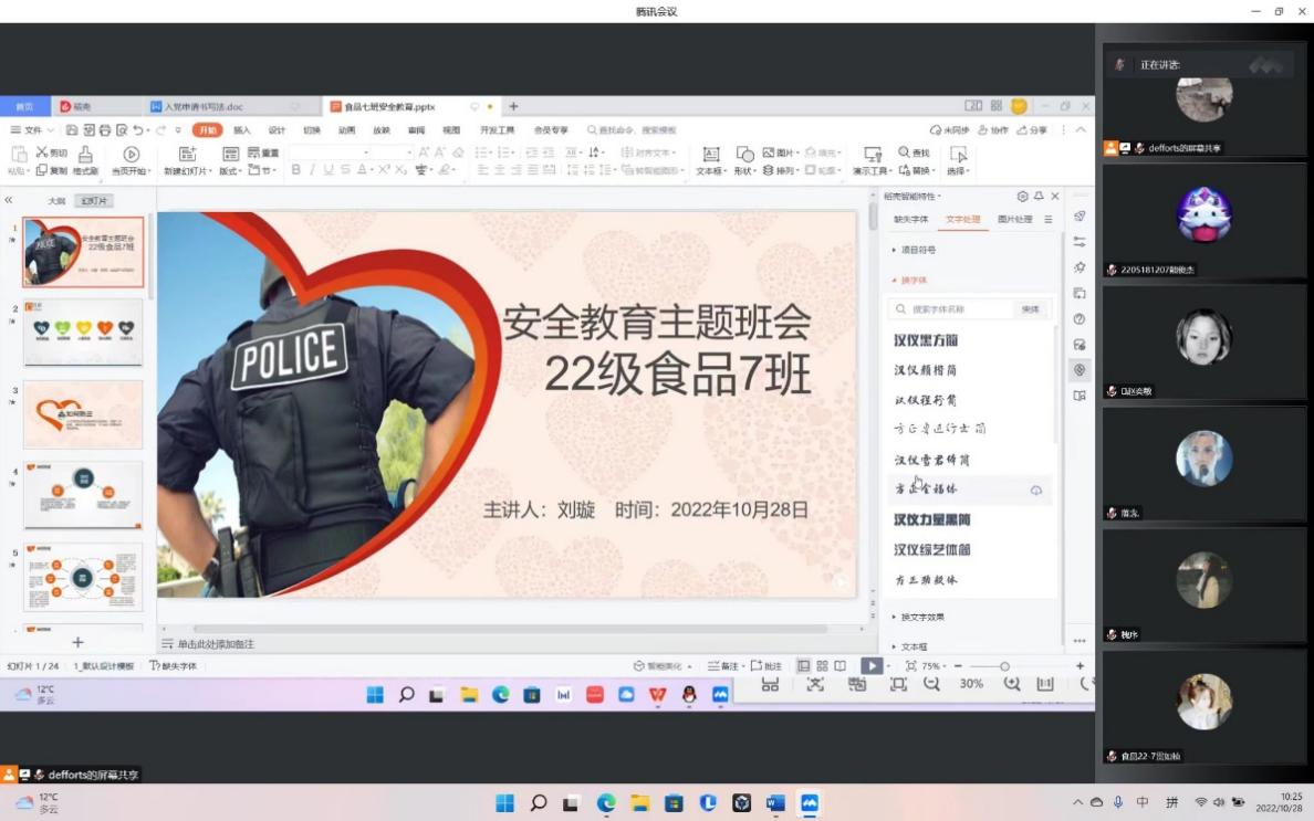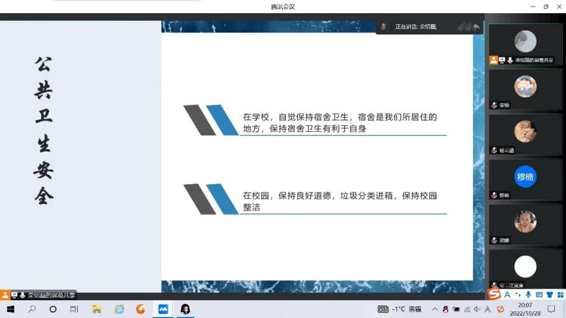 此次班会以团支部为单位,集中开展校园安全教育主题学习。会议强调,安全是一切工作的首要条件,大学生安全教育与大学生学习和生活紧密相连,同学们必须认真对待安全教育,将安全教育会议精神落到实处,避免意外事故的发生,共同创造安全和谐的校园环境。在会议中,各位班长向同学们普及了包含防疫、防火、防电、防诈骗和卫生安全等多个方面的安全知识,并提醒同学们在疫情防控期间要积极配合学校安排,按时进行核酸检测和健康上报。