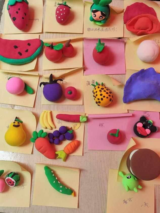 参加活动的同学来来往往,他们用双手创造惊喜,小小的橡皮泥被捏的形态各异。喜欢的食物是什么样子?同学们发挥自己的创意,在作品上给出自己的理解。