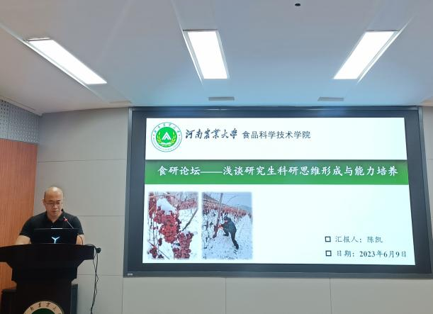 首先分享的是陈凯博士,他分享的内容主要围绕研究生科研思维形成与能力培养这一主题进行。他通过讲解自身对于葡萄酒品种香气研究现状的分析,以及对于自身课题的探究,生动形地传达了科研思维的行成过程。他强调了比较思维的重要性,因为有比较才有鉴别,有比较才能延伸视野,有比较才能更好定位定性。力求逐步实现本土意识与国际视野相结合,继承传统与创新精神相结合,科学知识与人文素养相结合,在“三个结合”方面持续不断地增强自身的跨学科思维和文化意识,把自己锻造成为德才兼备、具有跨越学科边界的创造性优秀人才。惟其如此,我们才有希望构建具有中国特色和中国气派的问题意识彰显、人文情怀在场的学科体系、学术体系和话语体系,提升学科的国际话语权和学术的国际影响力。