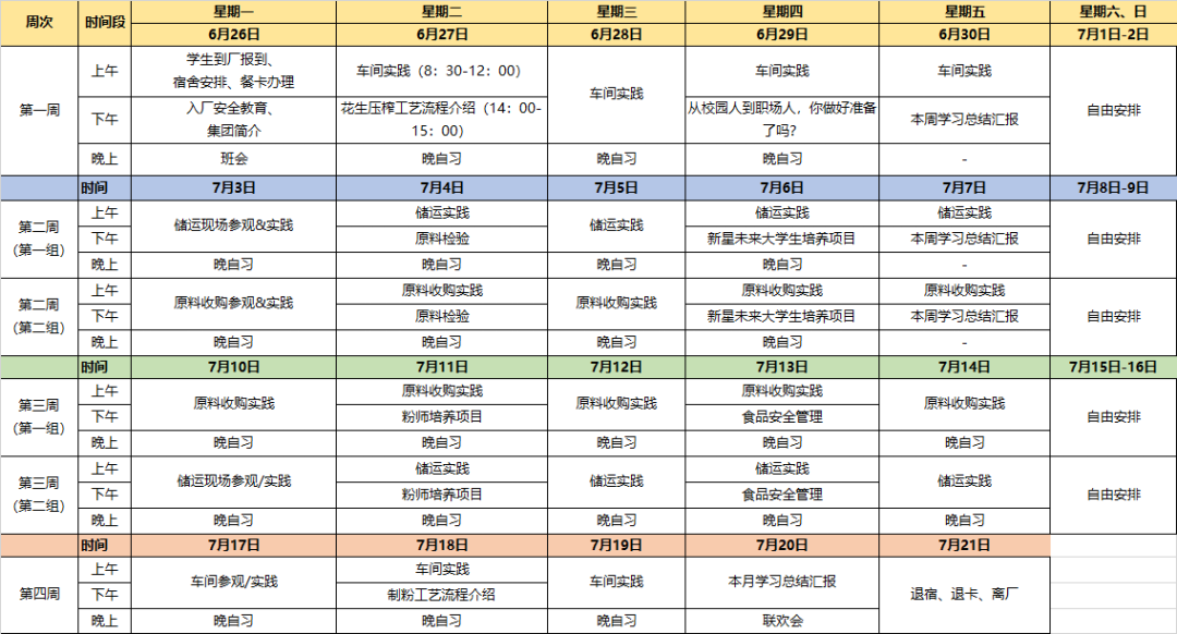 为了帮助同学们顺利做好为期一个月的实习工作,益海嘉里(开封)食品工业有限公司与带队老师经过反复沟通,制定了翔实的实习计划。