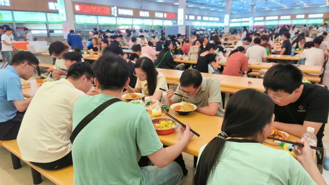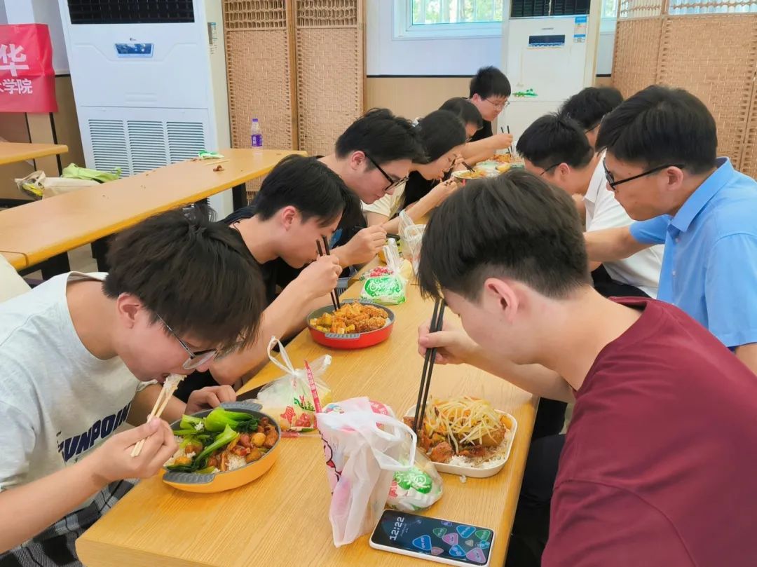 院领导与毕业生一同就餐。黄现青向毕业生们表达了感谢及祝福,希望同学们在未来的道路上能够一帆风顺,实现自己的人生价值。张金龙询问了周围毕业生的毕业感受及近期离校安排,叮嘱毕业生在离校时注意人身安全和财产安全。