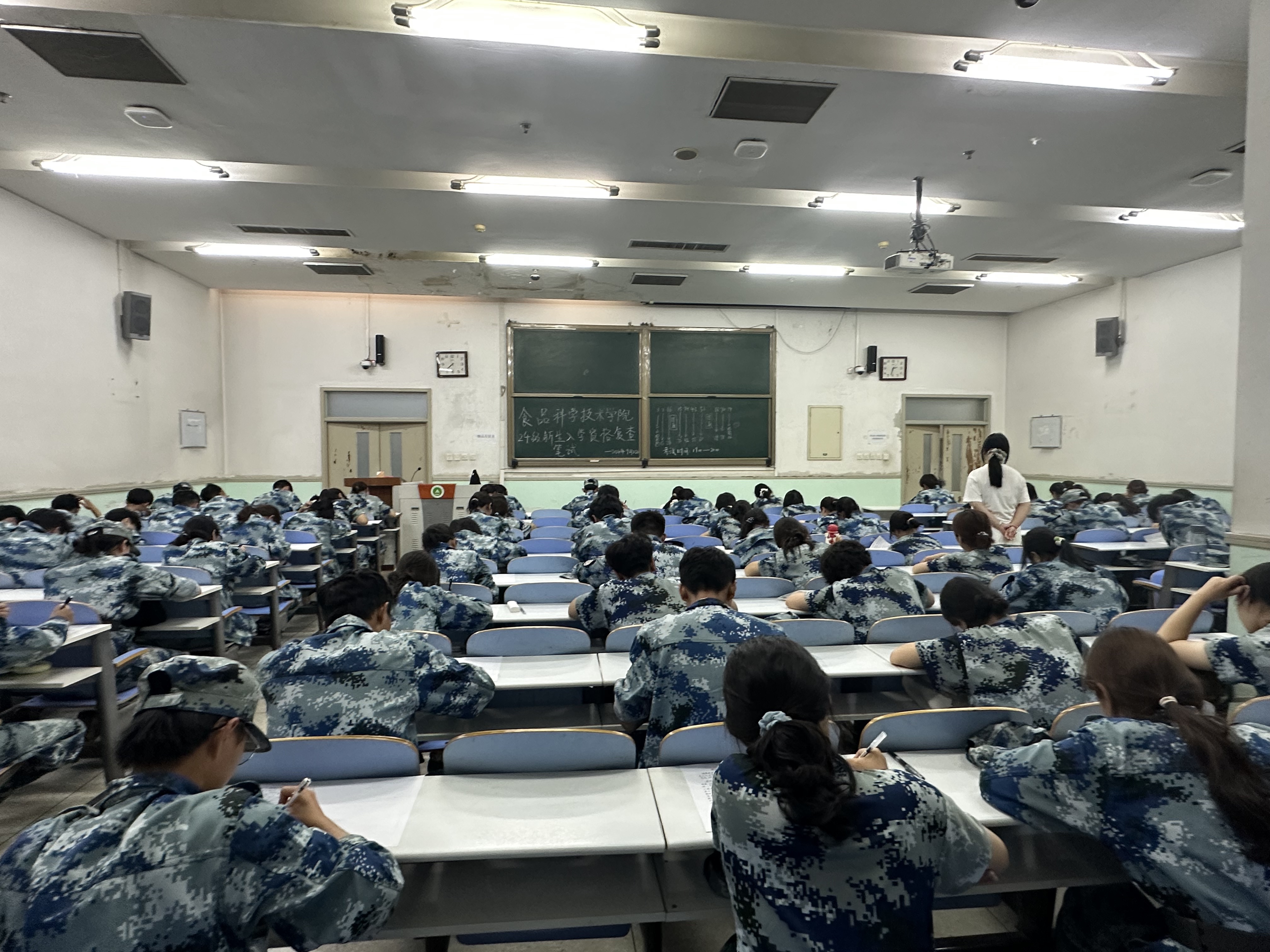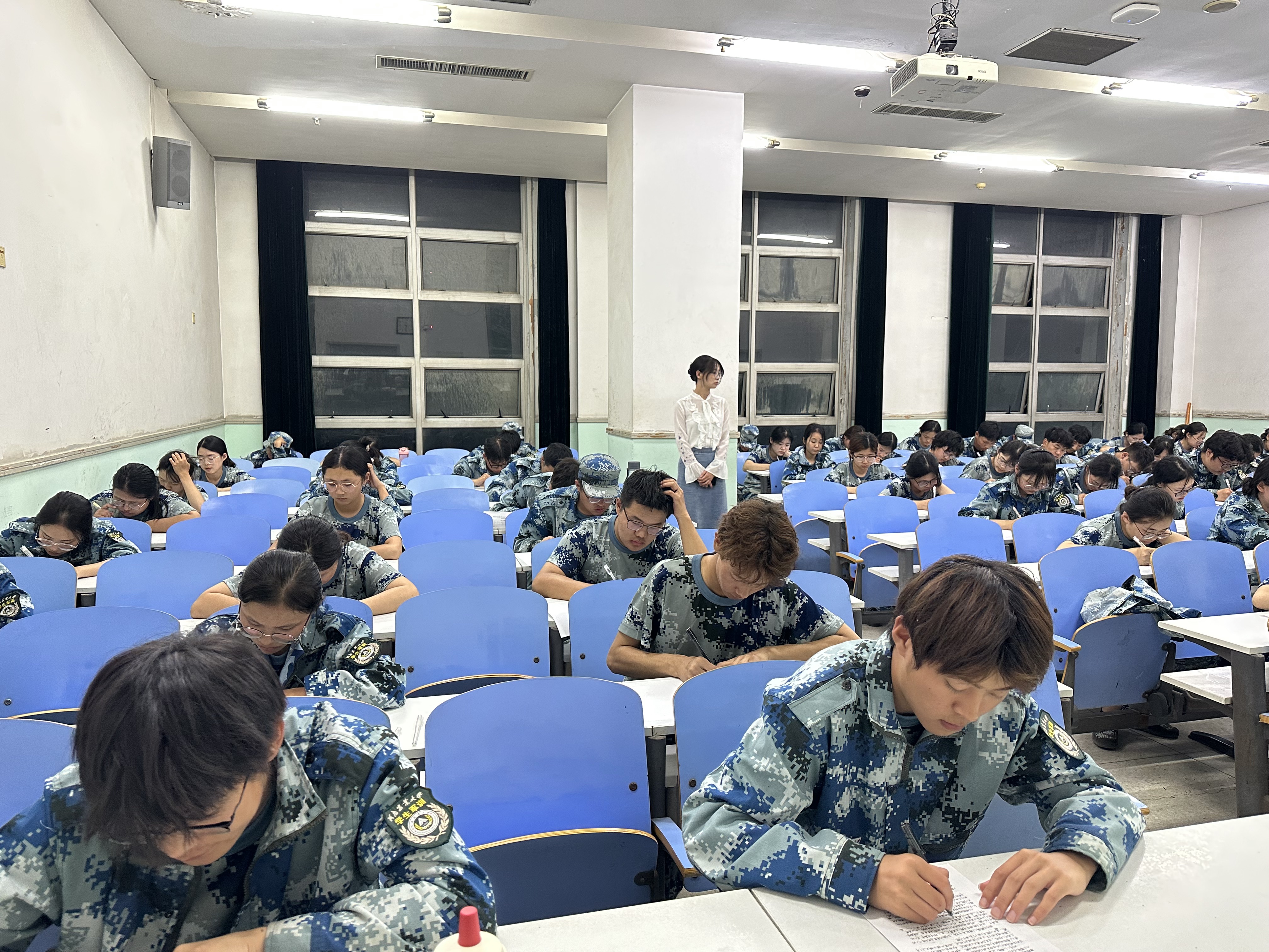 考场上,考生们统一穿着整洁的军训服,全神贯注地投入到考试当中。24级新生仔细阅卷、认真答题,展现了良好的学习风貌和求知精神。同学们认真思考的模样,如同璀璨的星辰,在考场上闪耀着智慧的光芒,让人深感欣慰。