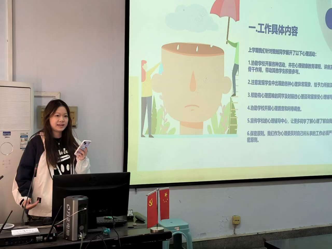 会议伊始,心理委员代表依次上台发言。张硕洋分享了心理委员的职责、在班级中的作用、目标设定等方面的相关经验;董恩妤则展示了自己的工作风采,并鼓励大家积极参与学院心理活动,加强与班级同学的沟通交流;尹晨曦提出要关注班级重点人群,提供个体化辅导,以此缓解学生心理压力;何盛境通过展示个人心理工作内容,引导大家在班级中开展心理健康教育宣传工作,关心同学们的情绪变化,及时发现问题、解决问题。