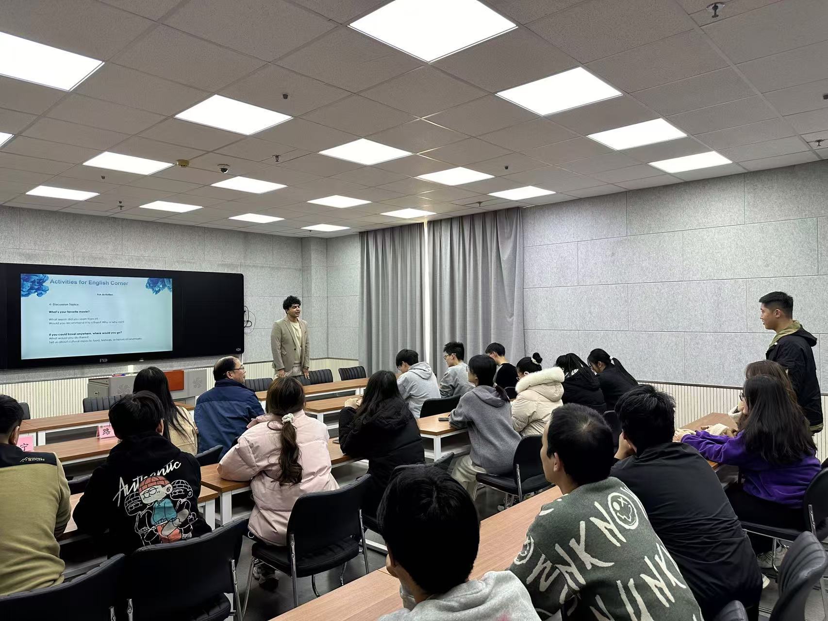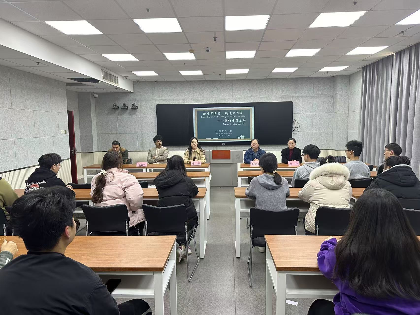 紧接着,特邀嘉宾Saif为同学们带来了一场英语学习经验分享。他的演讲风格风趣幽默,寓教于乐,为同学们提供了诸多实用的备考策略和学习建议。通过几个轻松有趣的小问题,Saif与同学们展开了互动,英语绕口令环节更是让大家沉浸在了不同语言魅力的海洋中。回答问题时,全英文的互动模式不仅考验了同学们的听力,也激发了他们用英语表达的热情。Saif鼓励大家在日常生活中积极运用英语,哪怕只是简单的问候和对话,也能在无形中提升语言的实际应用能力。分享结束后,同学们纷纷表示受益匪浅,对即将到来的英语四级考试充满了信心和期待。