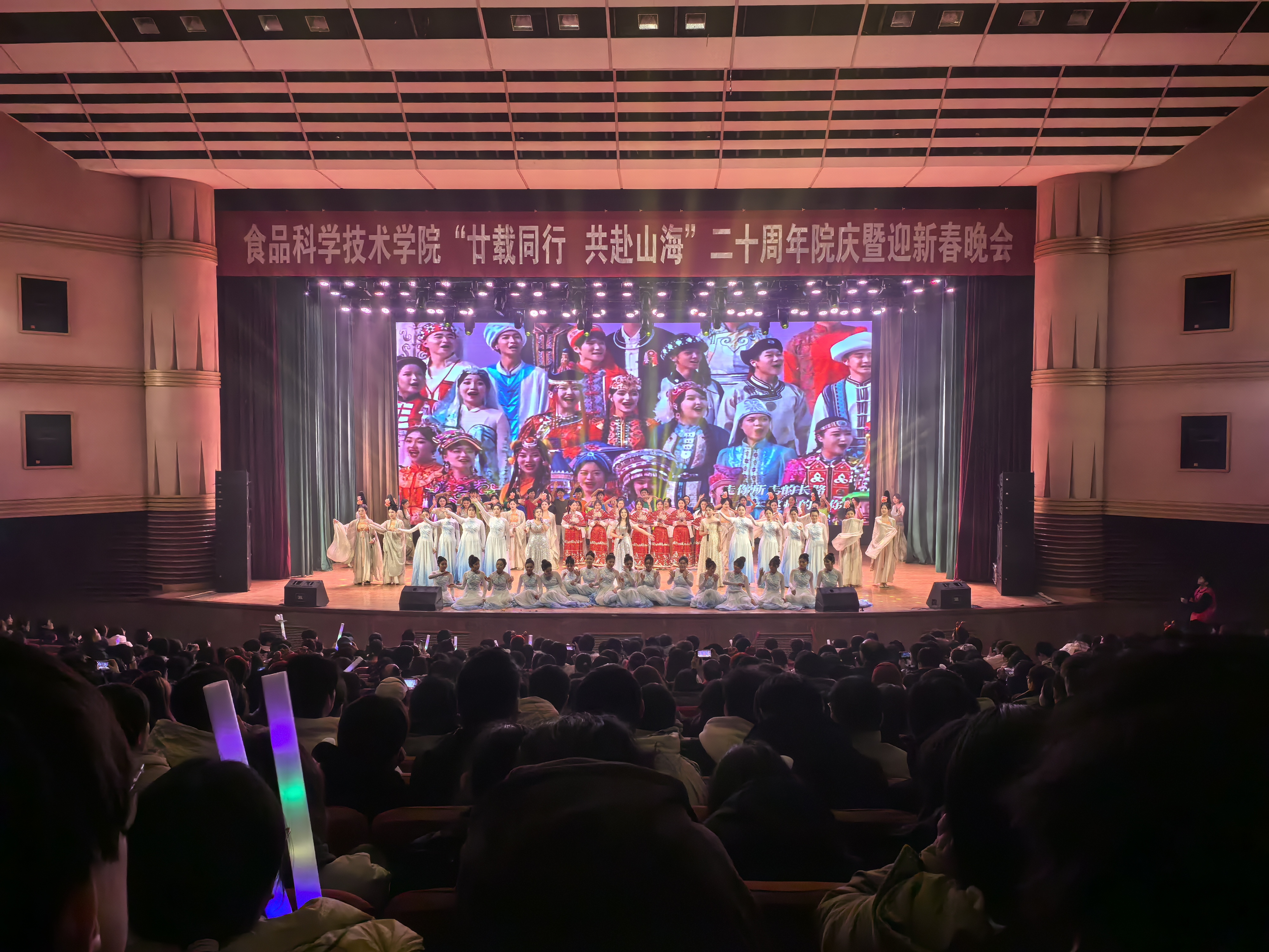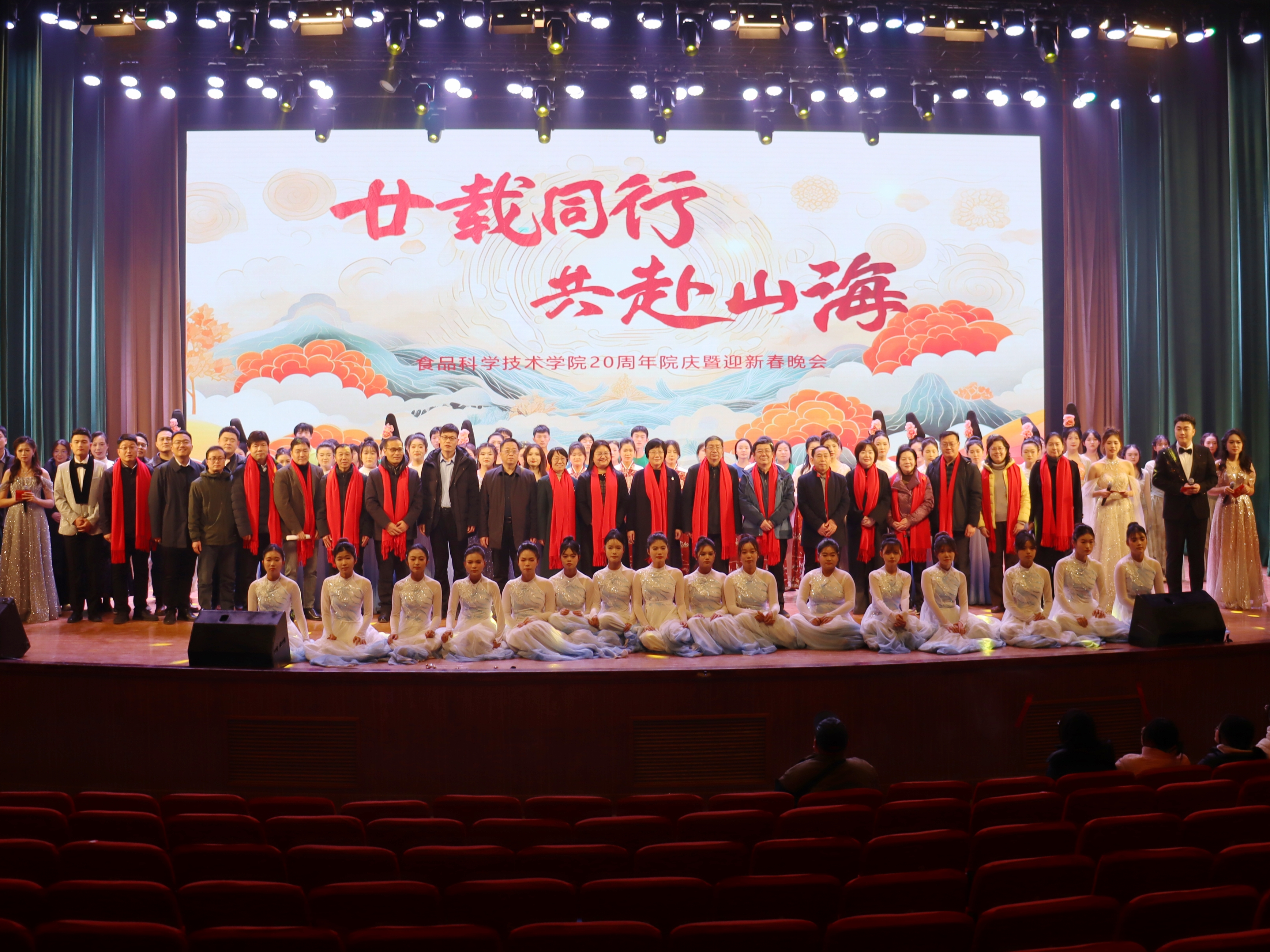 “廿载同行 共赴山海”二十周年院庆暨迎新春晚会,原学院党委书记杨喜洲、原学院副院长蒋玲玲、原学院办公室主任冯勤、校党委研工部部长、中国现代农业联合研究生院筹建办党委书记代莉、基建处党总支书记孙淑娥、基建处处长、中国现代农业联合研究生院筹建办院区建设部主任田琨、生命科学学院党委书记刘国兵、许昌校区教学试验场场长李宗品、校党委学工部副部长张二龙、校团委副书记雷雯、教务处副处长程西永、经济与管理学院党委副书记李蓓蓓、后勤处副处长李长旗、生命科学学院党委副书记张世昌以及学院全体领导教师、兄弟学院教师出席此次晚会。在这新春与旧日接力,未来与历史交会特殊时刻,礼堂内座无虚席,领导老师和同学们齐聚一堂,共同欣赏这一场厚重而华丽的视听盛宴。